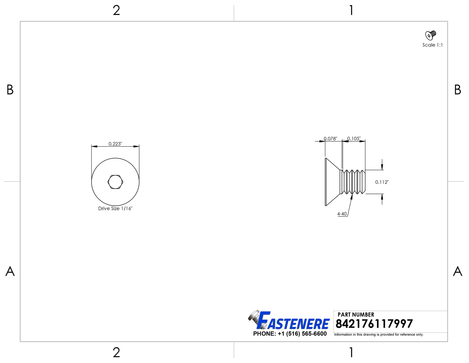 4-40 x 3/16" Flat Head Socket Cap Screws Allen Drive Stainless Steel Qty 2500 The stainless steel socket cap screw has a plain finish and a flat head with an internal hex drive. Stainless steel resists corrosion and may be magnetic. The flat head is cone shaped for use in countersunk holes and has a flat top that fits flush with the mated surface. The internal hex drive, also known as a hex-socket drive, has a hexagonal slot that requires an Allen key driver, also known as a hex key or Allen wrench. Socket cap screws are threaded fasteners that have a cap head with an internal socket drive for installing in areas with limited side clearance. These screws are available with a variety of head shapes, which determine how the screw interacts with the mating surface, and drive styles, which determine the type of tool required to install the screw. General Product Information Head Style : Flat Drive Style : Allen Hex Key Drive Size : 1/16" Thread : 4-40 Overall Length : 3/16" Quantity of Fasteners in Package : 2500 Detailed Product Information: Head Diameter : Head Height : 0.078" Countersink Angle : 82 Degree Thread Diameter : 0.112" Threads Per Inch (TPI) : 40 Coarse or Fine Thread : Coarse Thread Coverage : Full Thread Thread Length : 0.105 Key Notes: Flat head socket cap screws have a internal hex drive that can be driven with an allen key or hex bit and a machine thread that will match up to any internally threaded item with the same machined thread patern which is apart of the unified thread system Flat head screws have a flat top that tapers down to a cone shape that will sit flush into a countersunk hole and give a finished appearance 82 degree flat head is the most common countersunk screw head angle These flat socket cap screws are made of a high quality 18-8 grade stainless steel that offers a great corrosion and chemical resistance that will stand strong against the elements. Flat head countersunk machine screws length are measured from the top of the flat head to the end of the thread and the thread length is the overall length minus the height of the head Shipping: All orders placed before 3:30 pm EST Will Ship Same Day Tracking is provided on ALL Orders Priority Mail Shipping service is offered at a discount of only $3.95 UPS Ground UPS Next Day Air is available, Please inquire for pricing Returns : ALL returns are accepted if returned within 60 days. Money Back or exchange guaranteed. NO Restocking Fees. For YOU, we constantly strive to find ways of improving our performance.