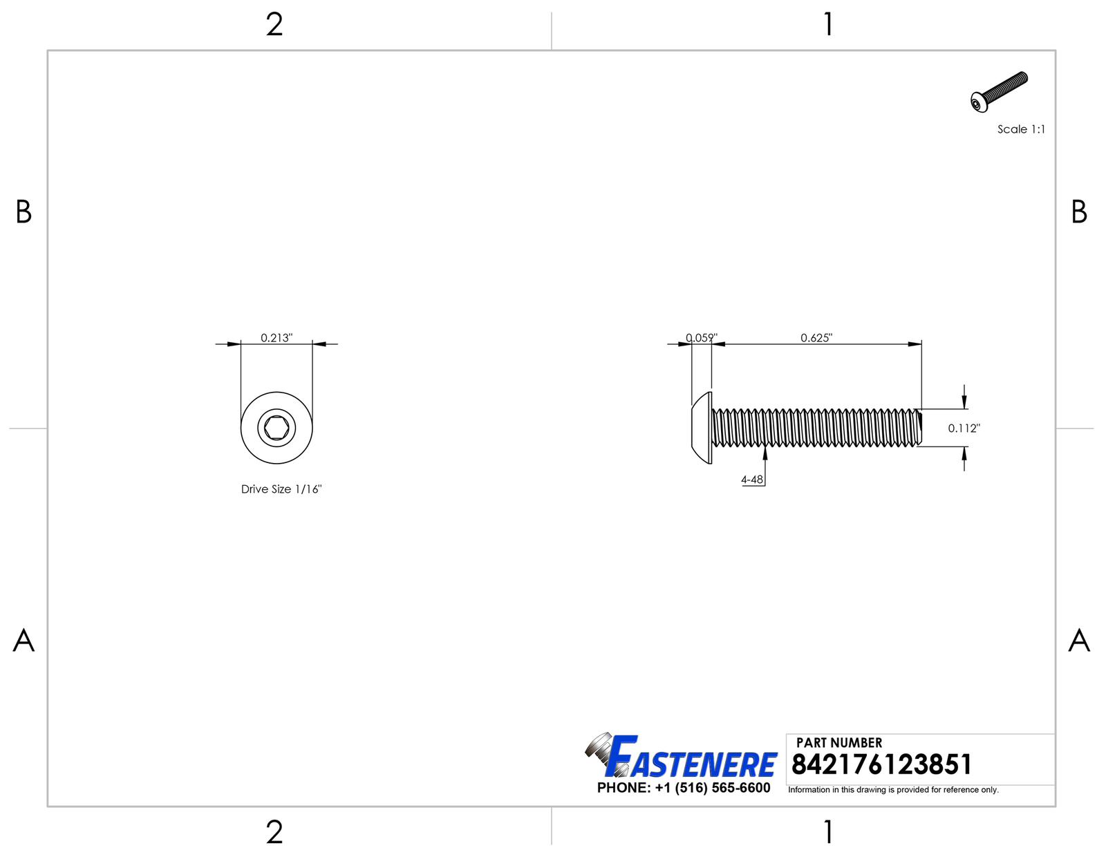 4-48 x 5/8" Button Head Socket Cap Screws Black Oxide Alloy Steel Qty 250 General Product Information Head Style : Button Drive Style : Allen Hex Key Drive Size : 1/16" Thread : 4-48 Length : 5/8" Quantity of Fasteners in Package : 250 Material Type : Alloy Steel Grade Rating : 8 Detailed Product Information: Head Diameter : Head Height : 0.059" Thread Diameter : 0.112" Threads Per Inch (TPI) : 48 Coarse or Fine Thread : Fine Thread Coverage : Full Thread Thread Length : 0.63 Key Notes: Button socket cap screws have a wide bearing surface and high tensile strength but are low profile allowing for clearance in tight spaces where there is not sufficient space for wrenches or sockets button head cap screw is recommended for lighter fastening operations and is not suggested for use in critical high strength applications where socket head cap screws should normally be used Black oxide is not a coating but a surface chemical conversion process that offers a mild corrosion resistance Fastenere black oxide button head socket cap screws are treated with a heavy water displacing oil that coats the fastener offering a greater level of corrosion resistance than most other black oxide fasteners These button cap screws are a grade 8 equivalent offering a high tensile and yield strength These fasteners have a machined thread pattern of 4-48 which is apart of the unified thread system Shipping: All orders placed before 3:30 pm EST Will Ship Same Day Tracking is provided on ALL Orders Priority Mail Shipping service is offered at a discount of only $3.95 UPS Ground UPS Next Day Air is available, Please inquire for pricing Returns : ALL returns are accepted if returned within 60 days. Money Back or exchange guaranteed. NO Restocking Fees. For YOU, we constantly strive to find ways of improving our performance.
