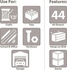 Color: Red Recommended Uses For Product: Office,crafts,sewing,storage,hardware Product Dimensions: 6"D x 20"W x 16"H Special Feature: Storage,stackable CABINET DIMENSIONS- 6.37"D x 20"W x 15.81" H, DRAWER DIMENSIONS- 6-Inch x 2-1/4 Inch x 1-5/8 Inch (small drawer), 6-Inch x 4-1/2-Inch x 2-3/16-Inch (large drawer) HIGH QUALITY- Rugged, high-impact polystyrene plastic frame and 44 drawers GREAT FOR– Storing and organizing classroom or office supplies, crafts, bead organizer, art supply storage, or sewing supplies, hardware, lego and small toy storage, fishing gear and more STACK OR WALL MOUNT- Cabinets stack securely and can also be wall mounted using keyhole slots molded into the back of the cabinet DIVIDABLE DRAWERS- 8 small drawer dividers, 4 large drawer dividers included and come molded into the back of the cabinet, finger-grip drawer pulls provide easy access and rear stop tabs prevent contents from spilling