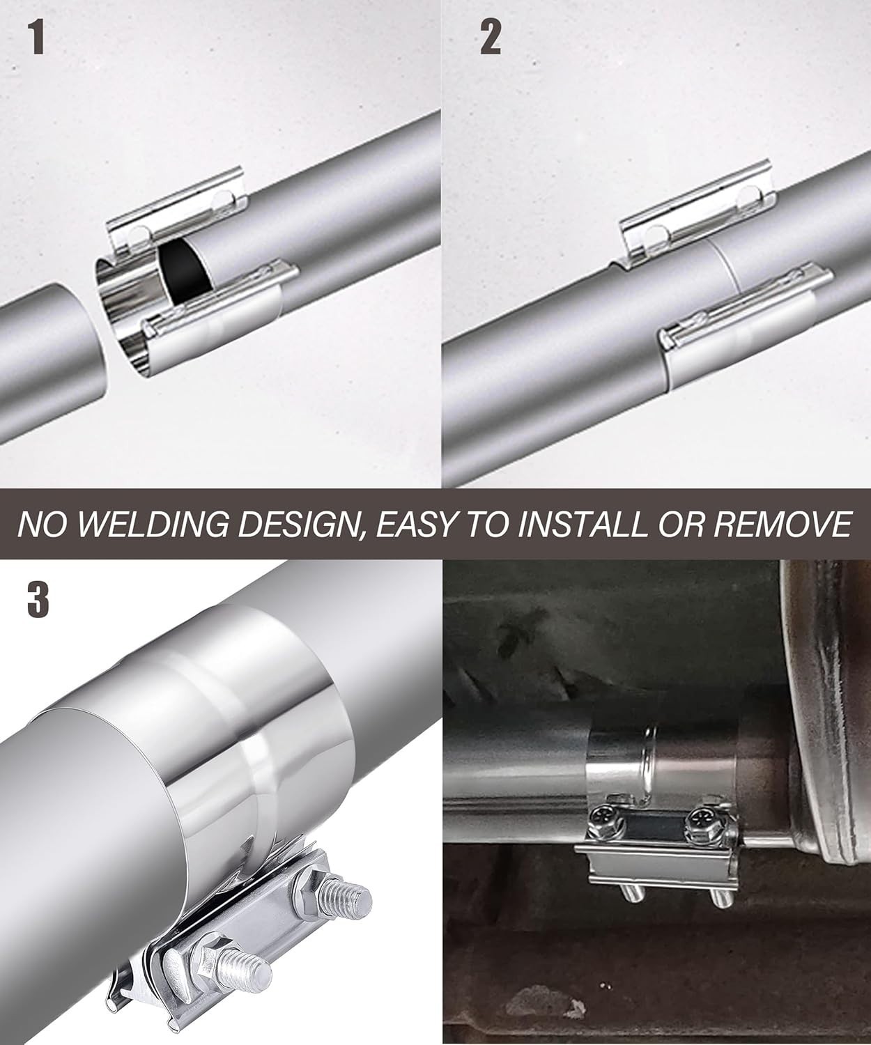 [Multiple Sizes]We have 6 different sizes of exhaust clips for you to choose from: 4" 3" 2.5 "5" 3.5" 2.75", you can purchase according to your needs. [High Quality Materials]The exhaust pipe clamp is made of high-quality 304 stainless steel and galvanized, which can resist water corrosion and rust, is durable, and has a long service life. [Features] These exhaust clamps adopt an integrated structure, minimizing the complexity of the number of parts and maximizing material efficiency, thereby reducing weight. 12.9 degree high-strength fasteners provide true sealing force, and the unique reaction block provides 360 ° uniformly distributed tensile force, completing sealing around the connected exhaust components while preventing pipeline deformation. [Easy to Install]The exhaust clamp is easy to install or remove, and the double-layer self-locking locking washer can prevent the nut from loosening. Fast, simple, and accurate, while minimizing noise and exhaust leakage. [Application] Lap clamps are a simple and effective method for connecting exhaust system components such as pipes, silencers, catalytic converters, etc. Widely used exhaust systems in the automotive, commercial vehicle, and off-road industries.