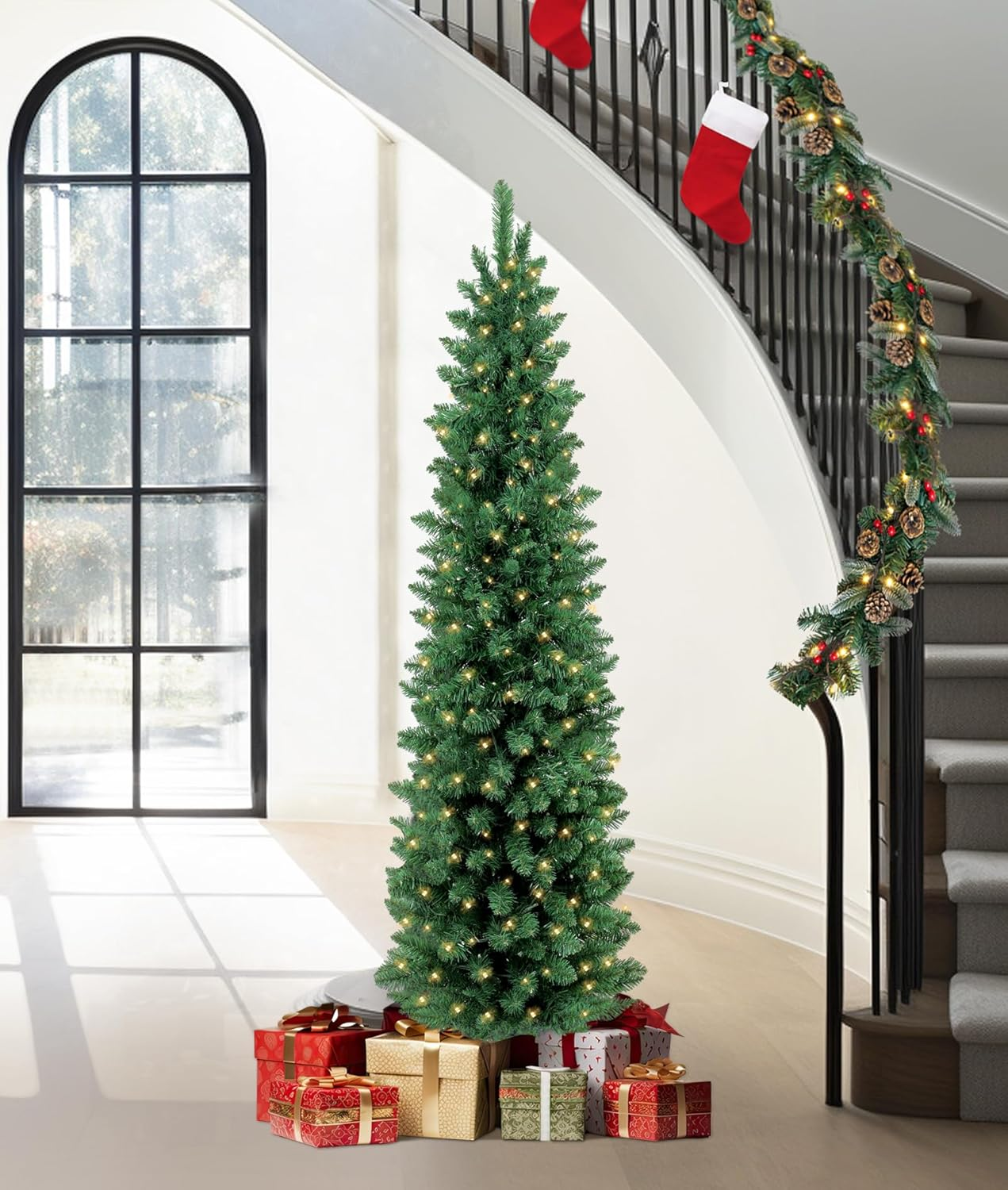 NATURAL LIFELIKE APPEARANCE - The realistic and festive appearance of this pencil Fir slim prelit christmas tree with lifelike branches adds a Christmas atmosphere to any setting; Number of Prelit Christmas Tree Branch Tips (4.5ft/6ft/7ft): 310/ 400/ 500 GREEN CLASSIC DESIGN - Artificially green branches are pre-strung in a series of warm white lights for a dreamy and Christmas appeal; Number of Lights (4.5ft/6ft/7ft): 150/ 200/ 220 EASY ASSEMBLE & FLUFFING - The semi-automatic branch trunk is easy to open and store-Just 3 steps: Simply fix the base and connect to the largest section(A) of the artificial christmas tree; Attach the remaining sections(B&C) and easily fluff the branches; Connect each set of male and female plugs, then plug into a socket to light it up. —Note: Gloves are recommended to fluff the leaves not to hurt your hands. HIGH-QUALITY CONSTRUCTION - Skinny pencil christmas tree branches and tips are made of premium PVC sustainable material, which makes them fire-resistant, harmless, and durable; the slim prelit christmas tree trunk and stand are made of sturdy metal, ensuring anti-collapse, sturdy and balanced, feel free to put on ball, star or other ornaments. CONVENIENT VERSATILITY - Instantly inspires the festive atmosphere of Christmas and add a touch of nature year-round; Press the light switch to explore various lighting modes and choose your favorite one; Accentuate different areas of your living space, office, or even a holiday party by customizing your prelit slim pencil christmas tree with garland, lights, ornaments, and more. Product description 1 Green 2 White 3 Pink 4 Black Get Yours Now and Dive into the Holiday Cheer! Color of Tree Green; White; Pink;Black Color of Light Warm White Light Material PVC + Iron Package Includes Christmas Tree×1; Metal Stand×1; Instruction×1; Screw×3 Shape of Tree Skinny Pencil Slim Tree Annecy Pre-Lit Artificial Slim & Full Christmas Tree Add to Cart Add to Cart Add to Cart Add to Cart Customer Reviews 4.0 out of 5 stars 32 4.0 out of 5 stars 32 4.0 out of 5 stars 32 4.0 out of 5 stars 32 4.2 out of 5 stars 23 4.2 out of 5 stars 23 4.2 out of 5 stars 23 Price — — $89.99 $ 89 . 99 — $125.99 $ 125 . 99 $119.99 $ 119 . 99 $119.99 $ 119 . 99 Tree Type Slim Pencil Slim Pencil Slim Pencil Slim Pencil Full Spruce Full Spruce Full Spruce Dimensions include 4.5ft/ 6ft/ 7ft 6ft 6ft 6ft 4.5ft/ 6ft/ 7.5ft 4.5ft/ 6ft/ 7.5ft 4.5ft/ 6ft/ 7.5ft Light Count 150/ 200/ 220 200 200 200 200/ 250/ 550 250 250 Tips Count 310/ 400/ 500 390 390 390 400/ 970/ 1200 970 970 Materials PVC, Iron PVC, Iron PVC, Iron PVC, Iron PVC, Iron PVC, Iron PVC, Iron Lighting Modes 8 Lighting Modes 8 Lighting Modes 8 Lighting Modes 8 Lighting Modes 11 Lighting Modes 11 Lighting Modes 11 Lighting Modes Light Color Warm White Light Warm White Light Warm White Light Warm White Light Warm White & Multi-Color Light Warm White & Multi-Color Light Warm White & Multi-Color Light