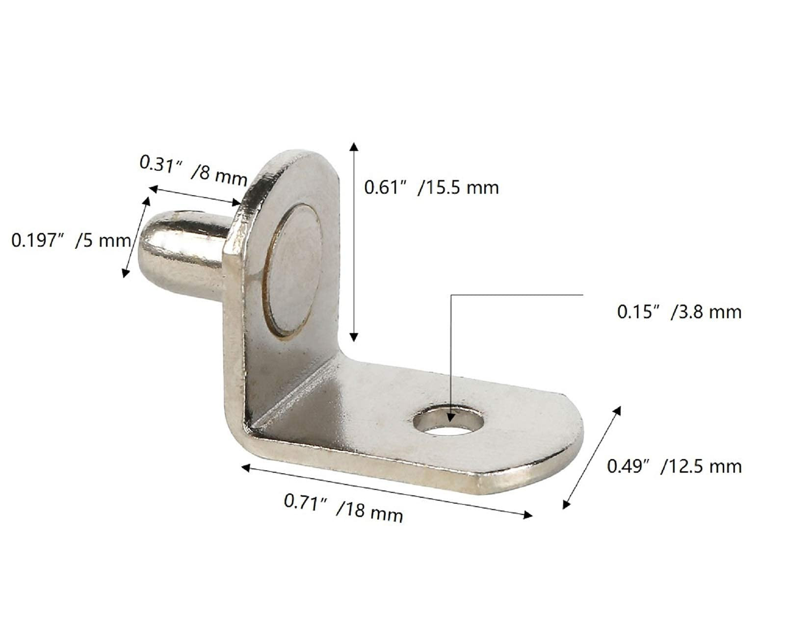 ★Size:Shelf support pegs include 45 pcs,shelf supports length: 18mm/ 0.71inch,shelf pegs pins diameter: 5mm/0.197 inch, shelf supports width: 12.5mm/0.49 inch,pin length is 8 mm/ 0.31 inch,hole diameter:3.8mm/0.15inch.please make sure the thickness of the cabinet will not lower than it. ★Material:Durable material,hard and durable for long using life,bracket style shelf support made of good quality metal and polished nickel,surface is smooth without burrs, will not easily rust and oxidized.cabinet bracket added safety - small hole allows the use of a screw to permanently secure the shelf. ★Applications:Nickel kitchen shelf support pins use for display cabinet, furniture, wardrobe,cabinet, bookshelf,bookcase, pantry shelving and so on ★Install:Nickel Shelf support pegs for cabinets are very easy to install by hand,please confirm the original hole size before purchase, avoid unable to use product, in order to make dowel pins a tight fit, your hole should be equal ★Customer satisfaction is our top priority,if there anything missed or broken,pls let us know,we'll reply within 24 hours
