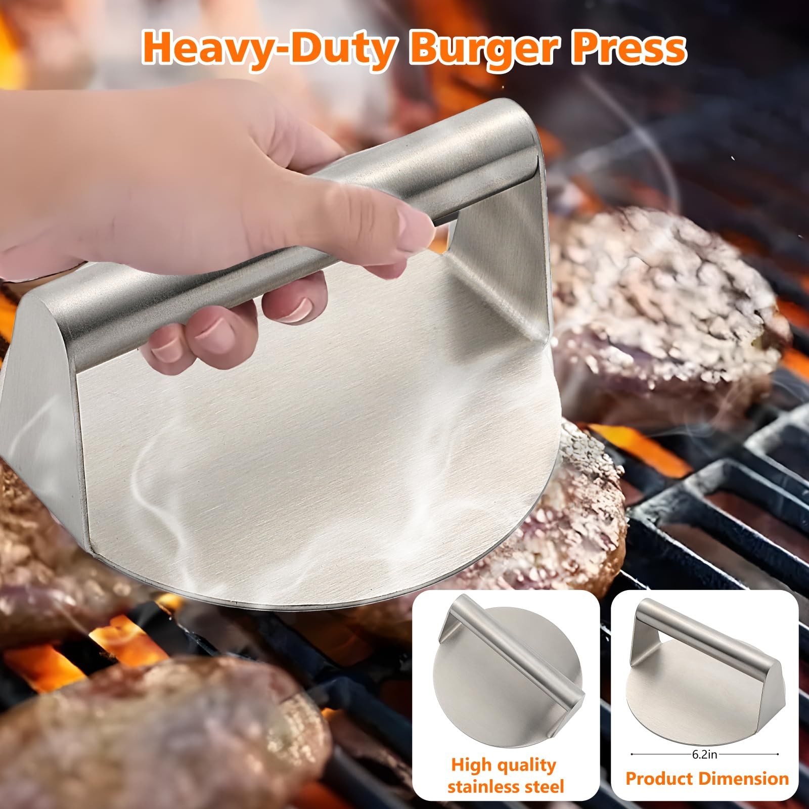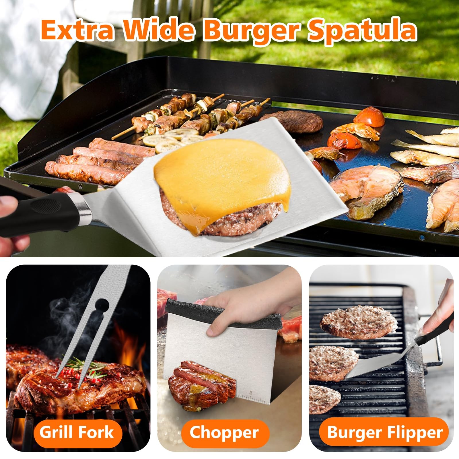 45-Piece for blackstone Griddle Accessories Kit Description: Enhance your outdoor cooking experience with our comprehensive 45-piece for blackstone Griddle Accessories Kit. This set includes essential tools for any camp chef, featuring a grill lid, burger press, spatulas, grill tongs, and much more—all conveniently packed in a carry bag. Ideal for professional hibachi-style cooking, this kit makes the perfect gift for men who love grilling. Included Items: Grill Lid: For even heat distribution and versatile cooking. Burger Press: Perfect for shaping uniform burgers. Long Spatula: Ideal for flipping and serving. Slotted Spatula: For draining excess grease. Large Burger Spatula: Specifically designed for flipping large patties. Small Spatula: For precise handling of smaller items. Dough Cutter: For cutting dough and other prep tasks. Grill Tongs: For secure flipping and handling of food. Grease Brush: For applying oils and sauces. Meat Fork: For turning and probing meats. Corkscrew: For opening wine bottles. 2 Squeeze Bottles: For dispensing sauces and oils. 4 Egg Rings: For perfect fried eggs. 2 Seasoning Bottles: For adding spices and seasonings. 6 Corn Holders: For holding corn on the cob. 8 Hooks: For hanging tools and accessories. 8 Meat Skewers: For grilling kabobs. Cleaning Brush: For maintaining your griddle surface. Carry Bag: For easy transport and storage. Instruction Manual: Detailed instructions for use. Color Box Packaging: Ready for gifting. Key Features: Comprehensive Set: Includes everything you need for professional-level grilling. High-Quality Tools: Made from durable materials to withstand rigorous use. Portable Design: Comes with a carry bag for easy transportation. Ideal Gift: Perfect for men who enjoy outdoor cooking and grilling. Easy Maintenance: Most items are dishwasher-safe; hand-wash the cast iron burger All-in-one BBQ Burger Grill Kit: This 45-piece griddle tool kit includes 12-inch melting dome,burger smasher, burger flipper, large burger spatula, griddle spatula, slotted spatula, chopper, knife, oil brush, grill tongs, BBQ fork, 8x BBQ skewers, 8x corn holders, 4x egg rings, cleaning brush, 8x hooks, and a convenient storage bag. All accessories for blackstone griddle you need is here. High-Quality Stainless Steel: Our grill accessories for blackstone are crafted from heavy-duty 304 stainless steel, ensuring compatibility for blackstone griddles. griddle accessories for blackstone are BPA-free, exceptionally sturdy, rust-resistant, heat-resistant, and built to last. Diverse and Essential black stone grilling accessories: Our grill set includes griddle spatulas for efficient turning, lifting, and frying; a burger smasher for creating evenly shaped, juicy patties; a burger flipper for effortless flipping and serving; a chopper for precise cutting and scraping; a 12-inch melting dome for even meat cooking; and various egg ring shapes for added culinary fun. Easy to Clean & Store: Our BBQ grill tools are non-stick and dishwasher-safe, making cleanup a breeze. Our griddle accessories kit includes 8 hooks for effortless hanging and organization. Plus, it comes with a spacious storage bag that fits all the items for easy carrying and storage. Professional grilling accessories for outdoor grill. Perfect Gift for Griddle Lovers: This BBQ grill burger accessories kit is a thoughtful present for those who love crafting delicious burgers on their griddle stones or Camp Chef griddle. An ideal Father's Day gifts, Thanksgiving gifts, Christmas gifts, and more. Perfect grilling gifts for men. Considerate birthday gift for dad.
