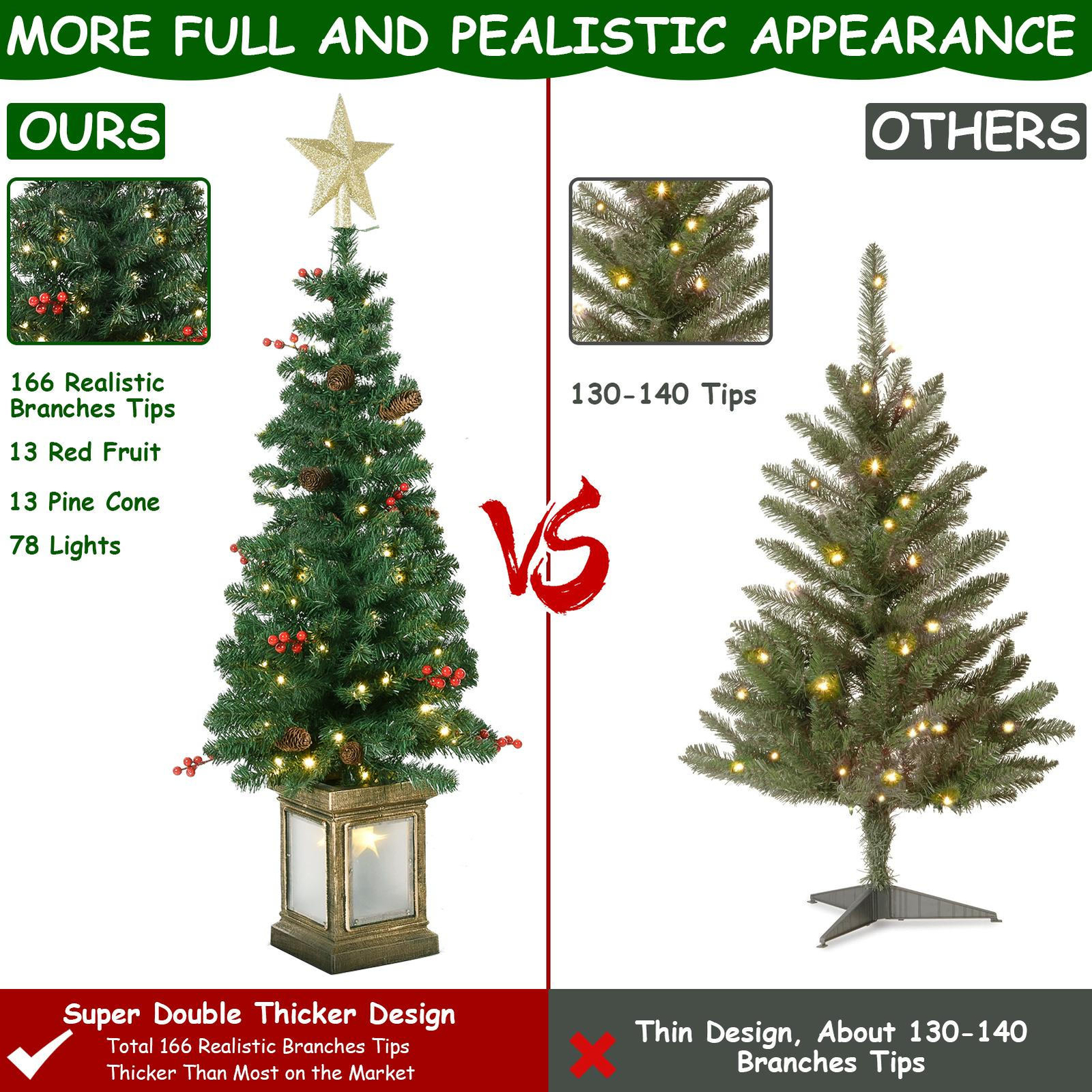 Store category Sign Up Now ! You may also like Product Description Bullet Points: Impress Your Guests: Our potted Christmas trees for front porch add a festive touch with their 105 lights (4ft) or 75 lights (4.5ft), pine cone berries, and 166-207 branch tips. Available in 2 sizes for a natural, full-bodied look, these trees are topped with stars for a complete holiday display. 8 Light Modes: Seamlessly transitions through 8 lighting patterns, from a gentle slow fade to an energetic chasing flash, ensuring your front porch is always dressed in holiday cheer. Christmas Elegance: Elevate your home's holiday charm with our Potted Christmas Trees for Front Porch. These stylish trees create a warm and inviting atmosphere at your doorstep, adding a Christmas atmosphere that's perfect for indoor or outdoor decoration. Sturdy and Safe: Crafted with metal hinges and PVC branches, this fake potted Christmas tree ensures a flame retardant and non-allergenic holiday season. Effortless Assembling: Achieve full trees for your front porch decor with ease! Fluff and shape the branches correctly for the lushest look, attach the base, and voila, a perfect festive centerpiece. Bring the festive cheer into your home with our Artificial Potted Christmas Tree! Topped and complete with stars, this tree twinkles and flashes adding a perfect Christmas decoration to your home. Made with sturdy materials, easily shape the tree correctly for the lushest, fullest look. Perfect for any space. Specification Material: Flame retardant PVC Battery box: Requires 3 AA batteries (not included) 4ft Height: about 121.92cm/48 inches Diameter: about 45cm/17.72 inches Number of Branch Tips: 166 Number of Light Beads: 75 Light String Pattern: 8 Patterns; IP44 waterproof Leaves Width: 6+5cm/2.36+1.97 inches Leaves Thickness: 0.12mm+0.1mm (Will not drop leaves, and will not be easily deformed during transportation) Intermediate Tube Diameter: about 1.6cm/0.63 inches Base Size: about 17.78cm/7 inches 13 Pine Cones, 13 Berries 4.5ft. Height: about 137.16cm/54 inches Diameter: about 50.8cm/20 inches Branch Tip: 207 Number of Light Beads: 105 Light String Pattern: 8 Patterns; IP44 waterproof Leaves Width: 6+5cm/2.36+1.97 inches Leaves Thickness: 0.12mm+0.1mm (Will not drop leaves, and will not be easily deformed during transportation) Intermediate Tube Diameter: about 1.6cm/0.63 inches Base Size: about 17.78cm/7 inches 15 Pine Cones, 15 Berries Pack List: 1 x Artificial Christmas Tree 1 x Base 1 x String Light Note: Due to different lighting and screen settings, the item color may be slightly different from the picture. Due to different manual measurements, please allow a 1-2cm difference in size. Payment Delivery details Terms of sales About us Feedback & DSRs Payment Before you palce an order, please kindly make sure that you have a paypal account. We accept PAYPAL payment only. Payment should be completed within 2 days after auction closed, or unpaid dispute will be filed for an closing auction. An unpaid case will be filled after 4 days. Delivery details We ship to your eBay address. Each package will be shipped to US by UPS Regular Parcel with tracking number. Please check your shipping address carefully before checkout, it can't be changed if order completed. All items will be shipped within 1-2 business day upon receipt of payment.Orders placed on weekend will be shipped within 3 days. If you do not receive your item in 7-10 business days.please contact us immediately for further assistance. We will be responsible for any damages or losses incurred in the shipping process. About us We maintain high standards of excellence FIVE STAR and strive for 100% customer satisfaction! Positive Feedback is very important to us. We hope that you contact us immediately Before you give us neutral or negative feedback, so that we can satisfactorily address your concerns. We promise to offer the lowest price and high quality produce. Our working time: From Monday to Friday(9:30 am to 18:00pm), we don't working on holidays ,hope you can understand and know that , thank you. Please always talk to us via ebay Message. We appreciate your business and look forward to growing our e-Bay sales with satisfied customers. Feedback Contact us If you have any questions, please feel free to contact with us by ebay Message during our business hours ( 9:30a.m. to 5:30 p.m.), or email us through eBay, we will try our best to help you to resolve it. For any presale or after-sale questions,please do feel free to email us! Due to the time difference, each email will be replied within 1 working day,and weekend will be delayed a bit. Feedback