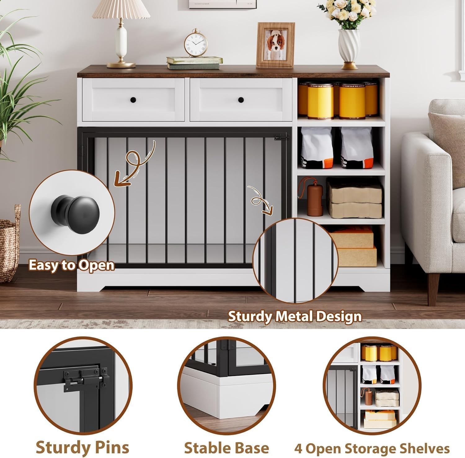 Sturdy Board & Metal Tube: Heavy duty dog cage crafted from high-quality wooden boards and strong metal bars. The robust materials are designed to resist teeth marks and scratches, ensuring long-lasting use even with active pets. The metal bars offer ventilation and visibility, letting your dog feel part of the family while staying secure. Farmhouse Dog Cage: With its rustic wooden finish and classic design, this dog crate furniture blends effortlessly with farmhouse, modern, or traditional home decor. Measuring 28.8 in L x 23.6 in W x 22 in H dog crate allows them to stand, turn, and lie down freely without feeling cramped. Secure Dual-Lock Doors: Designed with dual-lock doors that prevent even the craftiest escape artists from nudging their way out. The reliable locking mechanism ensures your dog stays safely inside, whether you’re away from home or simply need to keep them contained during mealtime or training. Multi-Functional Storage & Saving Space: More than just a dog crate, this piece doubles as a functional end table—perfect for placing lamps, books, or decor in your living room, bedroom, or entryway. It also features convenient large storage drawers and shelves, ideal for organizing dog food, treats, leashes, toys, and other pet essentials. Ideal for Large & Medium Dog: Whether you have a large or a medium dog, this indoor dog kennel offers a cozy, den-like environment that dogs naturally bed . The enclosed space helps reduce anxiety, providing a haven for your pet to relax while fitting seamlessly into your daily life. Easy Installation: All necessary parts and hardware come clearly labeled, and the step-by-step instructions are easy to follow, with simple diagrams that guide you through each stage. In just a short time, you can have the crate fully assembled and ready for your furry friend to enjoy.