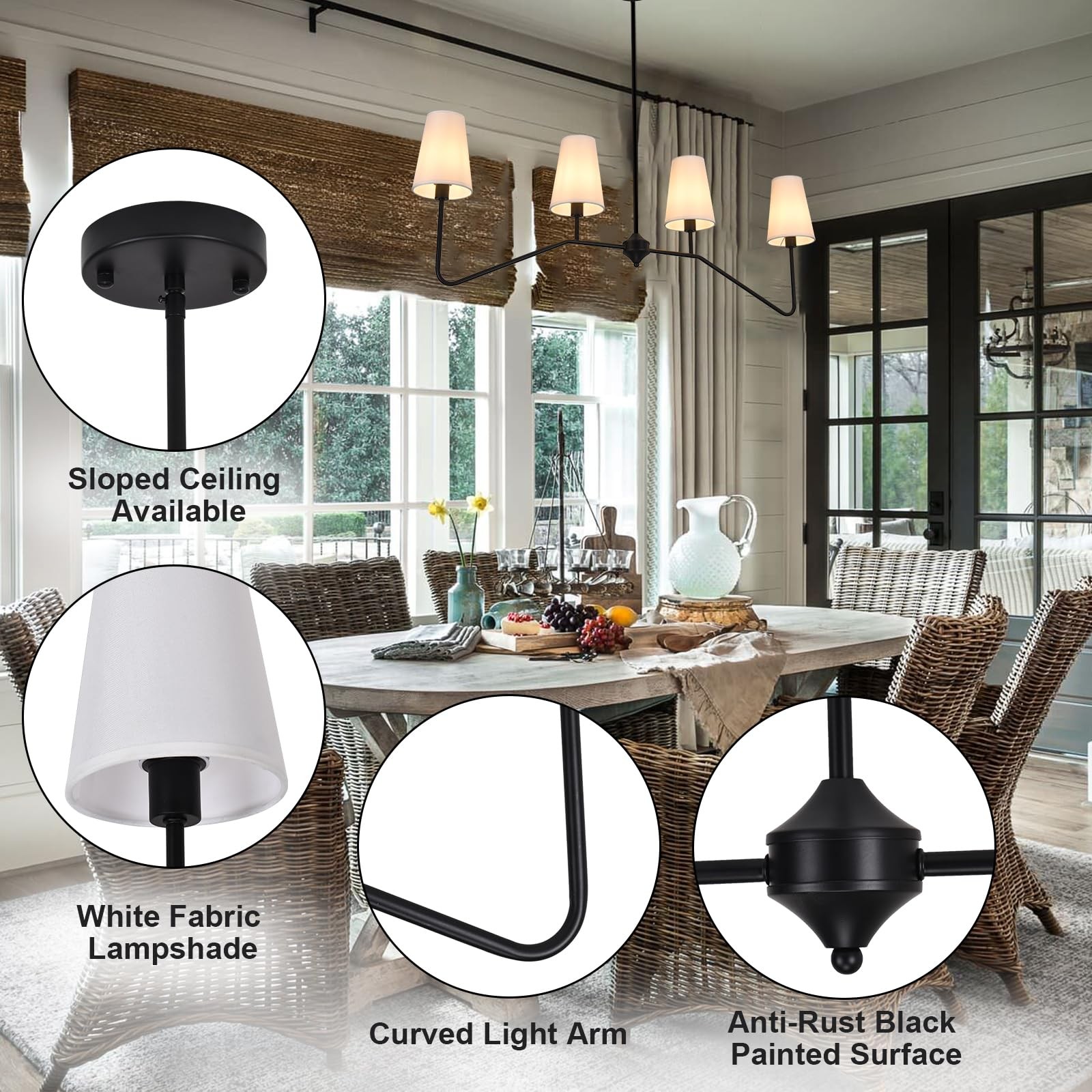 47" Kitchen Island Lighting Fixture 4 Light Linear Chandeliers Black with White Linen Shades for Dining Room 【Linear Chandelier for Dining Room】Black chandelier adopting a sturdy and durable black finished metal lamp body, paired with 4 fabric trapezoidal lampshade. The elegant white fabric lampshade provides ample illumination, greatly reducing glare, relaxing and soft lighting, creating a comfortable and warm atmosphere 【E12 Bulbs】The black dining room light fixtures works well with a variety of E12 type light sources from incandescent, LED, CFL, Halogen to Edison bulb. 4 of E12 candelabra base blubs, Max wattage per bulb: 40W. It is fully dimmable when using dimmable bulbs and dimmer switch.( Not Included) 【Adjustable Hanging Heights】Dining room light fixture size is 47"(W)*16.2"(H); Down Rod:2 X 13.7"+2 X 19.7" , Max Height is 66.8", there are 4 rods provides different hanging height. Works well as a high ceiling chandeliers as well as lower ceiling hanging pendants, you can choose the proper height base on your house to create a perfect look and home decor 【Easy Installation】:The farmhouse chandeliers for dining room is comparatively simple to install, included all mounting hardware and instructions. It submis sufficient soft lighting for your dining room, kitchen, living room, bedroom, foyers, entryway, etc. Note: if any part is missing, please feel free contact us for replacement 【Customer Service】We provide 3 years of free replacement service for any quality issues. The kitchen light fixtures are made of sturdy and durable materials, If you have any questions with modern chandeliers for dining room, please don't hesitate to contact us, we will provide you a satisfactory solution within 24 hours