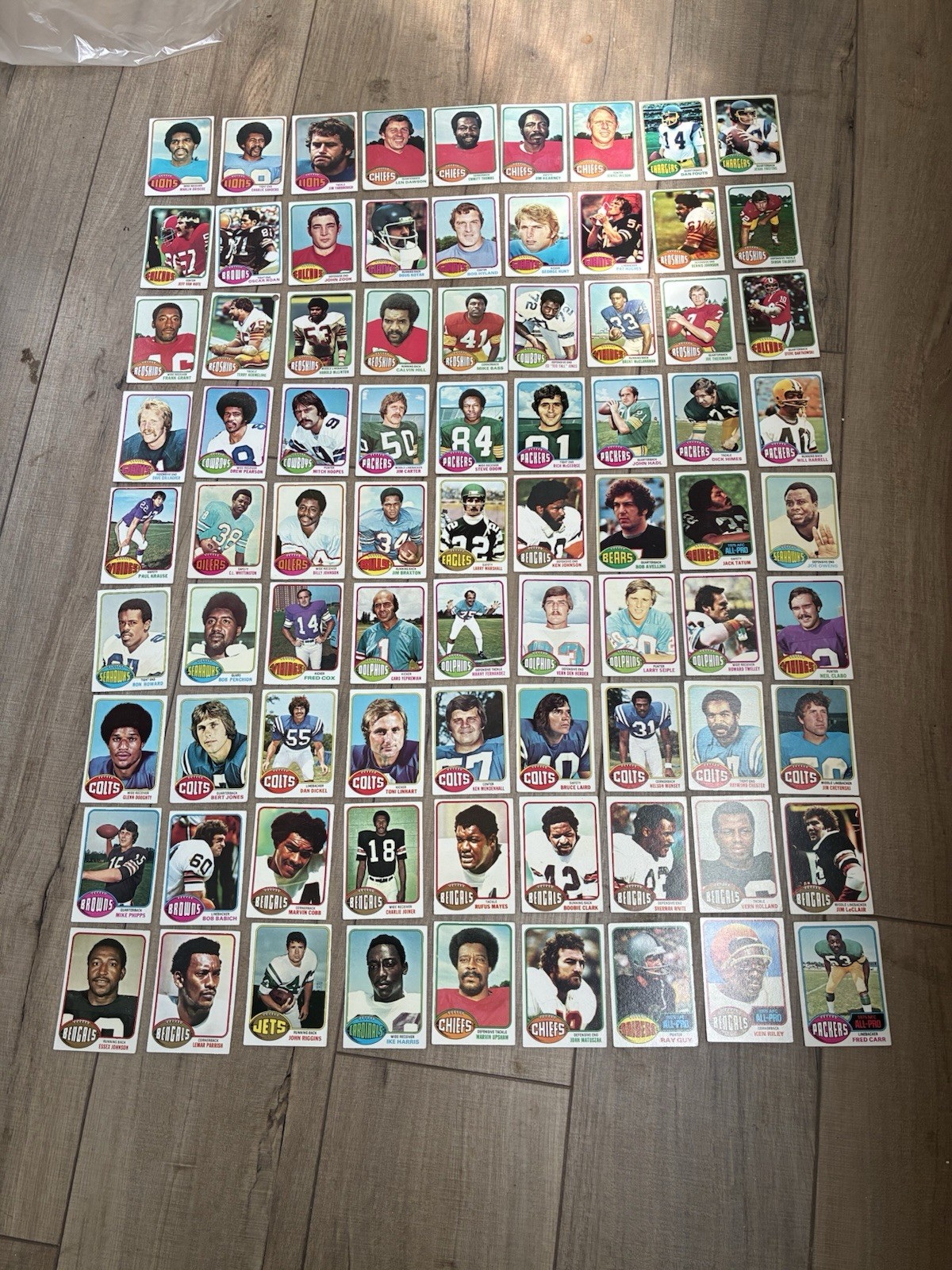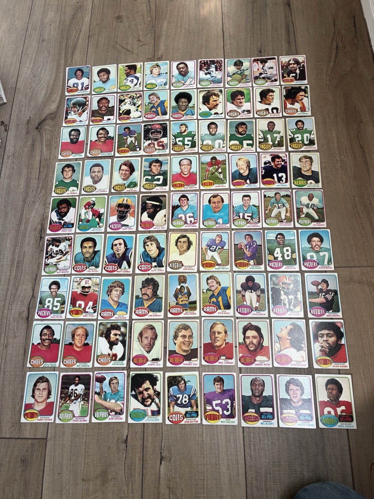 This lot consists of 489 vintage 1970's Topps football cards, featuring players from the National Football League (NFL). The cards are standard size and made of card stock. Manufactured by Topps in 1976, they are original and not autographed. This collection includes various players, teams, and events/features such as Rookie cards, making it a valuable addition for football card collectors looking for classic pieces from the 1970s. Including Walter Payton