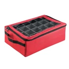The Ornament Storage Container by makes it easy to store away those special and irreplaceable Christmas bulbs and decorations. This rectangular-shaped storage bin with lid has adjustable dividers that can be arranged to create up to 48 individual compartments insides its two removeable trays. The folding storage box features a sturdy construction, stitched seams, side handles, a stackable design, and a zippered lip with a clear window for easy identification. ORNAMENT STORAGE - This rectangular storage tote has adjustable dividers that can be arranged to create up to 48 individual compartments. CUSTOMIZABLE - The 2 stackable trays can each hold up to twenty-four 2-inch standard sized bulbs, or you can manipulate the cardboard inserts to fit larger holiday decorations. CONVENIENT FEATURES - This ornament storage box has sturdy nylon handles on each side for easy transport, a zippered lid with window, and conveniently folds flat when not in use. DURABLE DESIGN - Constructed of thick carboard and durable canvas, this storage box with lid is designed specifically to protect your heirloom Christmas tree ornaments. MATERIALS - Canvas, PVC, Polyester, Cardboard, and Nylon. DIMENSIONS - (L) 20" x (W) 13" x (H) 6". COLOR - Red with Black Trim.