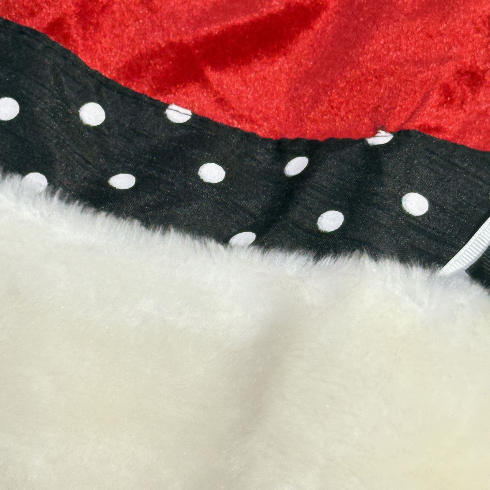 Add a fun and festive touch to your Christmas tree with this 48" red, white, and black polka dot tree skirt. Made from a combination of cotton and faux fur, this large round tree skirt features cute bow ties and a playful polka dot pattern. Perfect for any Christmas occasion, this tree skirt will add a touch of whimsy to your holiday decor. Never used