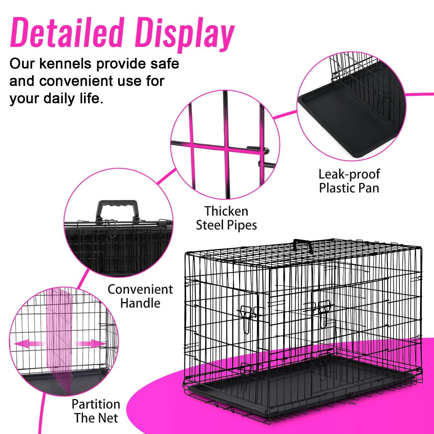 🐕【Dog Crate Made of Durable Materials】: the dog crate Made of high Tensile-Strength wire gauge.The dog cage ideal for training and transporting well-behaved pets. Pet crate epoxy coating finish extends the life of the crate and provides resistance against rust, corrosion, and fading, even in the most extreme climates. Dog crate dog cage pet crate. 🐕【Designed to Safe and Comfortable】: The pet cage have two large doors, one on the front and one on the side, are easy to open, close.Heavy duty securely lock with dual latches, providing a safe and secure environment for your pet.The dog cage designed to keep animals safe and comfortable. Pet kennel wire dog crate animal cage. 🐕【Easy Assembly】: This dog cage does not require any tool assembly, dog cage can be deployed directly. It only takes a few minutes. The pet cage divider can separate two pets in two spaces.Dog crate pet cage dog cage with divider. 🐕【Easy to Clean】: the dog cage includes a durable leak-proof ABS Composite tray that will not stain, warp, corrode or retain pet odors. The pet cage bottom pan features an integrated Lip around the perimeter, to contain any mess from spilling outside the dog kennel. Dog cage with tray pet crate metal dog cage. 🐕【Folds Easy to Storage and Portable】: this pet cage with handle is ideal for travel.Fold-and-carry construction dog crate with collapsible design that folds into a package less than 3" Thick. Features a removable carrying handle that can be mounted on any side of the crate as needed. You can easily carry or storage This dog cage.Dog crate with handle metal dog cage dog kennel.