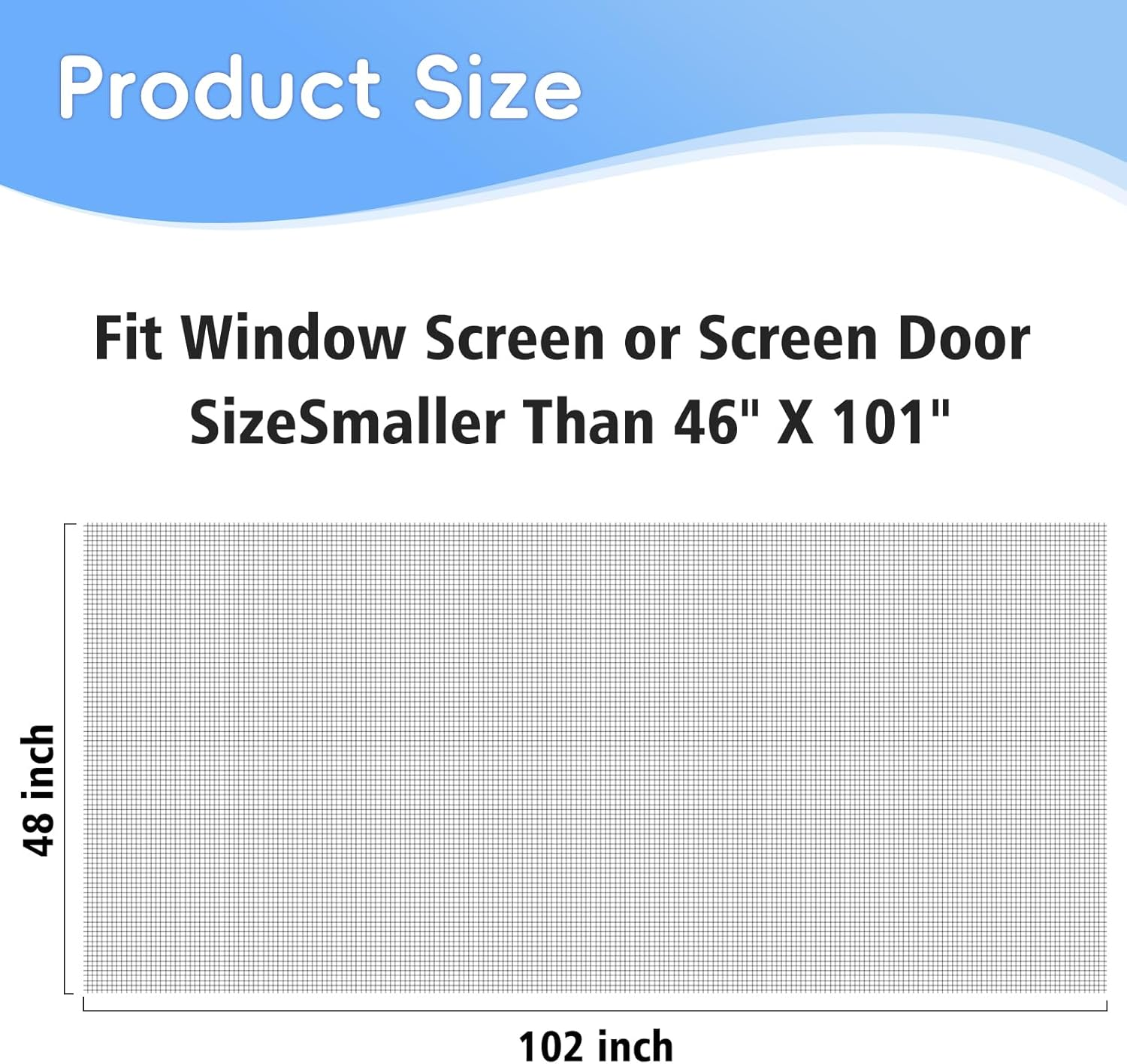 Window Screen:Experience years of reliable performance with our fiberglass window screen. Designed to withstand washing and sun exposure, its Radial strength is above 320N/Inch, weight above 110g/m2. Wide use: It's perfect for various kinds of screen doors, screen windows, sliding door screen and courtyards. Easily removes the old screen and broken mesh that scratched by pats. Advantage:Clear view from the inside of house, smoothly fresh air circulation. The screen mesh provides 75% UV protection. Long service time:This kind of screen mesh can be washed and exposed to the sun—the service life of this fiberglass screen at least five years. Good Choice after comparison: Choose our window screen mesh for superior quality compared to standard options found in supermarkets. While the mesh may arrive folded in the package, any creases will naturally disappear over time after complete installation. 48"x102" Windows Screen Mesh,Fiberglass Window Screen Mesh, Screen Door Mesh, Windows Screens and Screen Door Replacement, Patio Screen Mesh
