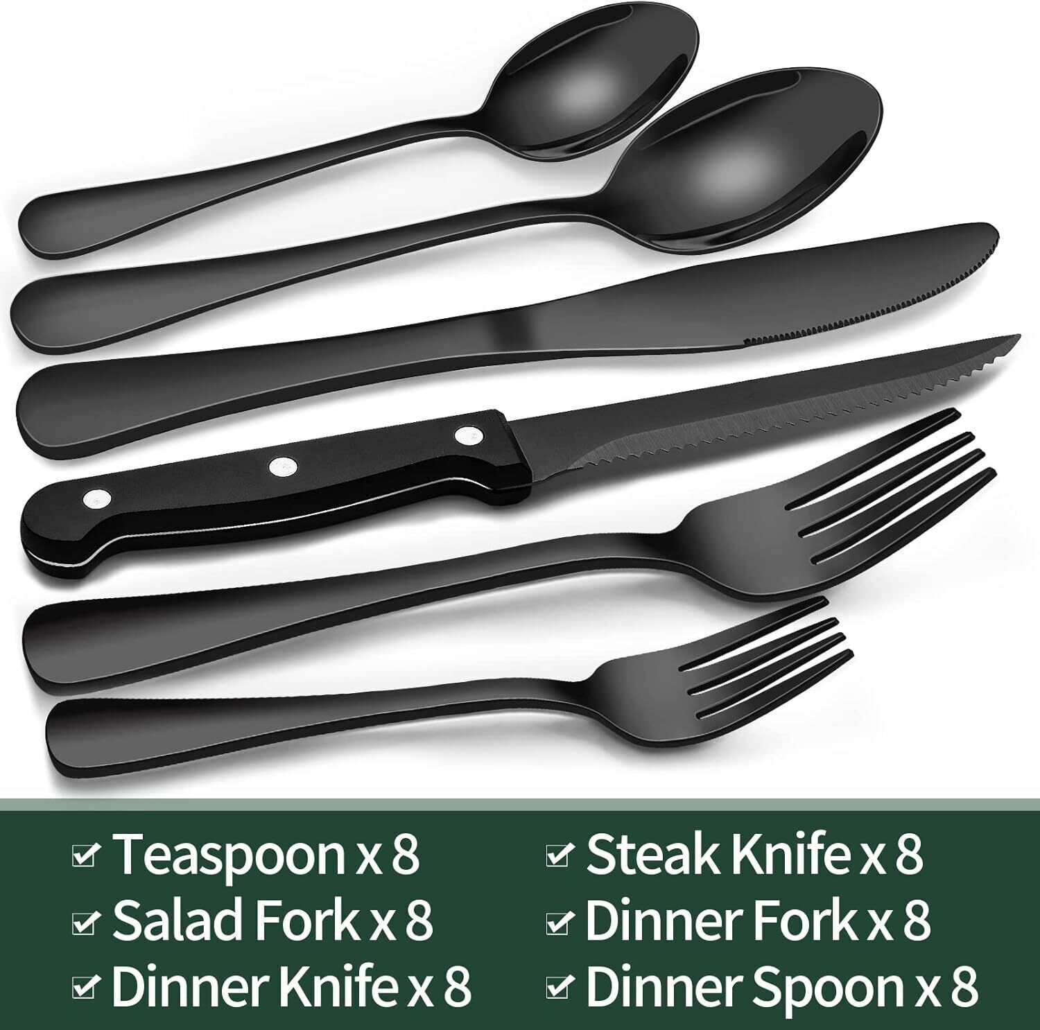 Specific Uses For Product Utensils Material Stainless Steel Special Feature Durable Color Black Finish Type Polished Unit Count 48.0 Count Package Type [Predicted: Shipped in a box with protective packaging materials] Number of Items 48 Manufacturer EWFEN See less Item Weight 5 Pounds Number of Compartments 5 About this item PREMIUM 48-PIECE BLACK SILVERWARE SET FOR 8: This flatware set contains 8 dinner forks, 8 salad forks, 8 dinner spoons, 8 dessert spoons, 8 dinner knives and 8 steak knives. It’s the ideal set for home daily use, and also for restaurants, pubs, cafes, and hotels. This cutlery set also help your dinner full of design while having a party. 8 STEAK KNIVES INCLUDED: 8 additional steak knives are offered in this pack that are also made of stainless steel with sharp serrations on the blades help it easy to cut meat, and being ideal to use for eating. The triple riveting handle is strong and durable even when cut hard, and the ergonomic design makes it very comfortable to hold. COMFORTABLE DESIGN: This flatware set has a classic silhouette with clean lines and polish-finish surface in all black, a good choice to go with your existing tableware. The smooth edge of the handle is pleasure to hold, appropriate weight and perfect balance are added to ensure maximum comfort during use. HIGH-QUALITY STAINLESS STEEL: Made of premium food-grade stainless steel, providing the longest term value and the best properties, it offers nice resistance to rust and corrosion to get the most sturdy and healthy experience while using, never bend in daily use. Specific Uses For Product Utensils Material Stainless Steel Special Feature Durable Color Black Finish Type Polished Unit Count 48.0 Count Package Type [Predicted: Shipped in a box with protective packaging materials] Number of Items 48 Package Dimensions 15 x 12.95 x 2.72 inches Item Weight 5 pounds