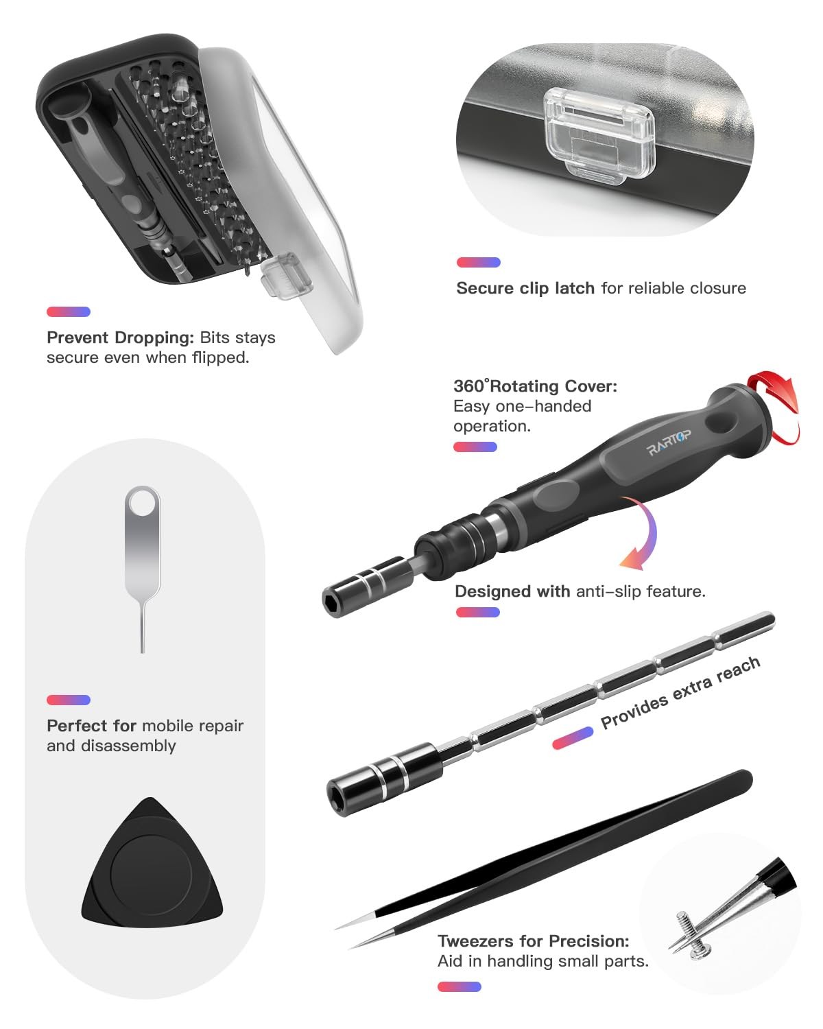 Screwdriver Set – Precision Screwdriver Bit Sets 130 in 1, Mini Hex Phillips Torx Slotted Screwdriver Bit Set with Tool Box, Ideal for Electronics, Laptop, iPhone, Jewelers and More 【Versatile Repair Tool】 precision screwdriver set is an essential toolkit for electronics repair enthusiasts. With 41 screwdriver bits and a comprehensive selection of screwdriver types and sizes, including Phillips, Flat Head, Pentalobe, SAE/Metric Hex, Star, Triwing, Triangle, Torx screwdriver set and more, and precision bits, it's perfect for repairing various electronic devices such as computers, laptops, iPhones, MacBooks, PCs, game consoles, eyeglasses, and more. 【Premium Quality Construction】This mini screwdriver set includes bits crafted from high-quality CRV steel, ensuring durability and resistance to wear and tear. This guarantees longevity and reliability of the screwdriver bit set.The magnetic design of the screwdriver tips facilitates easy handling and manipulation of small screws, while the ergonomic handle provides a comfortable and secure grip during use. 【Convenient and Portable】This precision screwdriver set comes with a sturdy and compact case, making it easy to store, organize, and transport. Each screwdriver bit is securely stored in its designated slot, preventing loss or misplacement. The clip latch close firmly, adding security to the precision screwdriver kit for you. The portable design ensures convenient usage for on-the-go repairs, and its compact size also makes it a pocket screwdriver set. 【Wide Application】 Whether you're a professional technician or a DIY enthusiast, this screwdriver set is suitable for a wide range of repair tasks. From replacing components in electronic devices to assembling furniture and appliances, it's versatile enough to handle various repair and maintenance projects with ease. 【Lifetime Warranty】guarantees the quality of our premium screwdriver sets and electronic toolkits with a lifetime warranty and a 30-day money-back guarantee. Contact our customer service for any assistance or refund requests. Shop confidently with us.