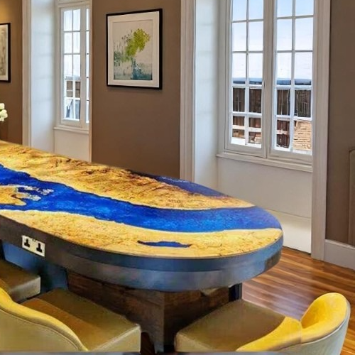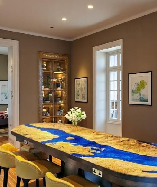 Table Size: 48"x30" Inches Stand Size: 28.5" Inches Tall Experience the pinnacle of craftsmanship with our Handmade Wood and Epoxy Resin Trading Desk, designed to enhance your workspace with a blend of modern elegance and artisanal quality. Each desk is crafted from premium Walnut wood, enriched with vibrant pigments that create a stunning visual effect. The result is a unique, functional work of art that serves as both a statement piece and a practical surface for your trading or gaming needs. Key Features: Premium Materials: Our desks are crafted from high-quality wood and epoxy resin, combining durability with artistic beauty. The rich texture of the wood is accentuated by the glossy resin, making each desk a one-of-a-kind masterpiece. Customizable Options: Choose from a variety of stand colors, including Black, Silver, or Golden, to perfectly complement your interior decor. Additionally, we offer customization for size and shape, allowing you to create a desk that fits your exact specifications. Contemporary Design: The resin river design adds a contemporary touch to your space, ensuring your desk stands out as a unique focal point in any room. Perfect Gift Idea: This desk is an ideal gift for those who appreciate exceptional craftsmanship and modern design. Its stylish appearance and functional design make it a thoughtful and impressive gift. Live Edge Detail: We use the finest live edge wood slabs, sourced from both domestic and exotic species, ensuring each desk has a natural, organic feel. The live edge detail adds a rustic charm, making each piece truly unique. UV Resistant Resin: The high-quality resin used in the tabletop not only enhances the beauty of the desk but also offers exceptional strength and durability. It’s UV resistant, ensuring that the vibrant colors and glossy finish will last for years to come. Ordering Information: Made to Order: Each desk is meticulously handcrafted upon order, ensuring a personalized touch and the highest attention to detail. Worldwide Shipping: We offer global shipping, with buyers responsible for any applicable customs and import taxes. Please note that due to the use of raw wood, each desk may vary slightly from the one shown in photos, adding to its uniqueness. Thank you for visiting........................