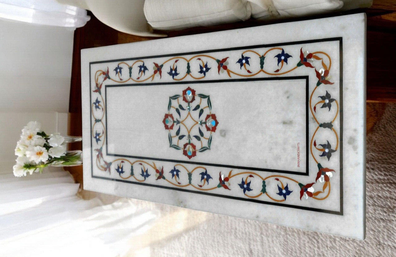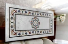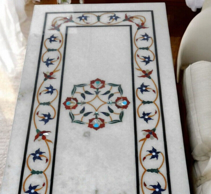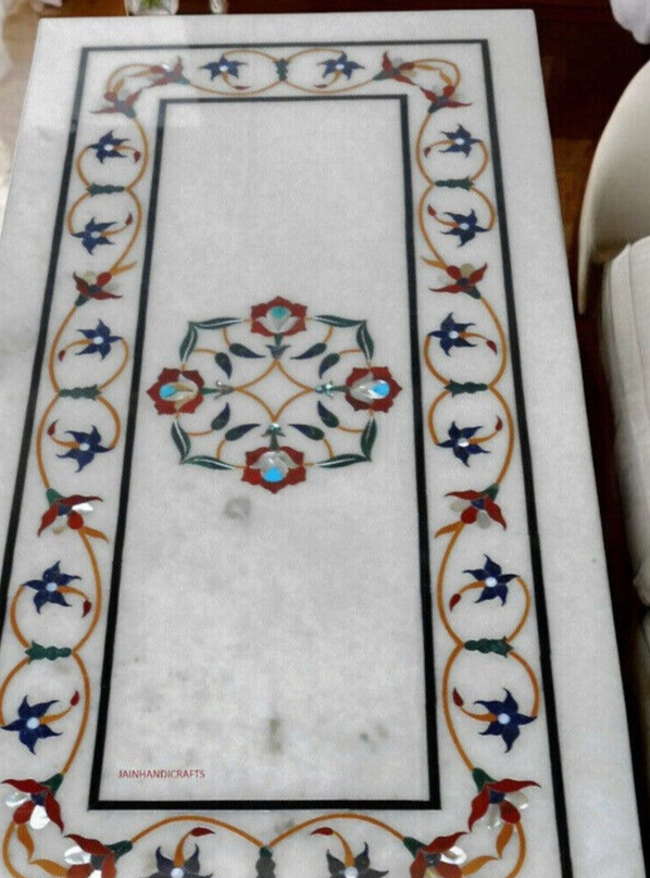 Product information Size: 48"x36" Inch Material: Marble & Semi Precious Inlay Stones Shape: Rectangle Thickness: 15-20 mm Finished- Polished Marble Inlay Table Tops We are the Manufacturer of Marble inlay furniture,Pietradura Coffee Table,vase,chessboard,boxes,photo frames,patio,Foyer,dining tables,Bathroom tiles,Back splash,Floor medallions & lots of exclusive handmade home decorative,Garden decor & collectible items For interior designers& Architects.This Beautiful art is a dying in Agra,India & We are trying our best to keep this beautiful art alive. They can also be placed outdoors in the garden, as marble is stain free, offers great resistance to the forces of nature, and can withstand heavy temperatures. We also meet customized requirement and offer our marble table tops at industry leading prices. Process of Making Marble Inlay We are inlaying semiprecious stones in three different colors of marble White Marble,Black Marble & green marble. The Marble used to inlay the semiprecious stone comes from city of Makrana, Rajasthan India. First we cut the marble in different shape example Round,Octagonal,rectangle,oval & square shape. After cutting the marble we paint the surface of marble with Hina(red Color) so we can sketch the geometry on the surface of Marble. With the Help Of emery wheel we cut,polish & shape the semiprecious in different forms of flowers,buds,leafs & stems all the cutting of the semiprecious stones are manually cut by the artisans. After cutting the semiprecious stones we assemble them to complete the motif & then the semiprecious stones are placed on the surface of marble so we can trace them on the surface of marble to make the exact size of the cavities once the stones are traced we remove the stones from the surface of marble & then manually we chisels the marble with the diamond chisels & tungsten carbide chisels once the cavities are completed we place the semiprecious stone in the cavities to check the depth of the stones. When we are fully sure that the stone fits well in the cavities we use special kind glue to fix the semiprecious stones into the marble. After completing the inlays into the marble we first rub the surface of marble with sandstone & then we polish the surface of marble with sandpaper which brings the natural shine on the surface of marble & to the semiprecious stone & we use wax polish to make the surface shiny. Most interesting expect of this pietre dure( marble inlay with hard stone) all the designs are made by the artisans are purely an imagination of artist once made they cannot make another one exactly the same it will look similar but will not be the same. This beautiful art is a dying art of Agra,India the artisans those make this beautiful art are the descendants of those families who built the Tajmahal in 17 century Tajmahal is a monument of love & you can easily see the artwork done with the same technique on the walls of the Tajmahal. I Invite you to come to Agra,India & visit the beautiful Tajmahal & you will surely be impressed & we request you give us a chance to show you the true handmade art of Agra by our artisans. When you are purchasing this beautiful handmade Marble inlay art you will always be happy because all the pcs made by our artisans with love,hope & happiness. You will always be enjoying the beautiful handmade marble inlay artwork secondly you will be supporting the local artisans of Agra,India to keep this beautiful dying art Alive. All the purchase benefits the artisans & the buyer as there is no middle men in selling & buying. USE OF THE PRODUCT It is beautiful for Home & garden decorative handmade Inlay Art add Royal Ambiance to your Home. You can use this as a Dining/Coffee Table, Side Table, End Table, Corner Table & Hotel, villa, home use, hall Flooring / Walling, corridors, vestibules of apartment or villas in the external & interior decorations. Note We welcome your personalization request (custom request) as per your size, shape and design but you have to pay spare money. Buyers are liable for any customs and import taxes that may apply. I'm not liable for delays due to customs. This is only table top which does not include any wooden, marble legs/base/stand. if you like to buy marble or wooden legs/base/stand you need to spend spare money for it. Marble inlay handicrafts & other natural marble products are handmade products, colors of semiprecious stones & marble used may slightly vary from the image shown. Equipment & accessories are used only for photography purpose which do not ship with the product. We are unable to ship to a PO Box address & for Russia, Brazil country we need firm entity name or business name parcel will not go to individuals name. If you have any query please feel free to contact us. Shipping & Packaging For shipping we use DHL & FedEx Export packing sealed wooden, crate with foam plastic straps outside. If there is any Local Tax, Custom Duties or Vat at the destination, it will be paid by the buyer. Inspiration/Story Behind This Product This beautiful art is a dying art of Agra,India the artisans those make this beautiful art are the descendants of those families who built the Tajmahal in 17 century Tajmahal is a monument of love & and one of the seven wonders in the world you can easily see the artwork done with the same technique on the walls of the Tajmahal. Wish you a very happy day & Happy shopping