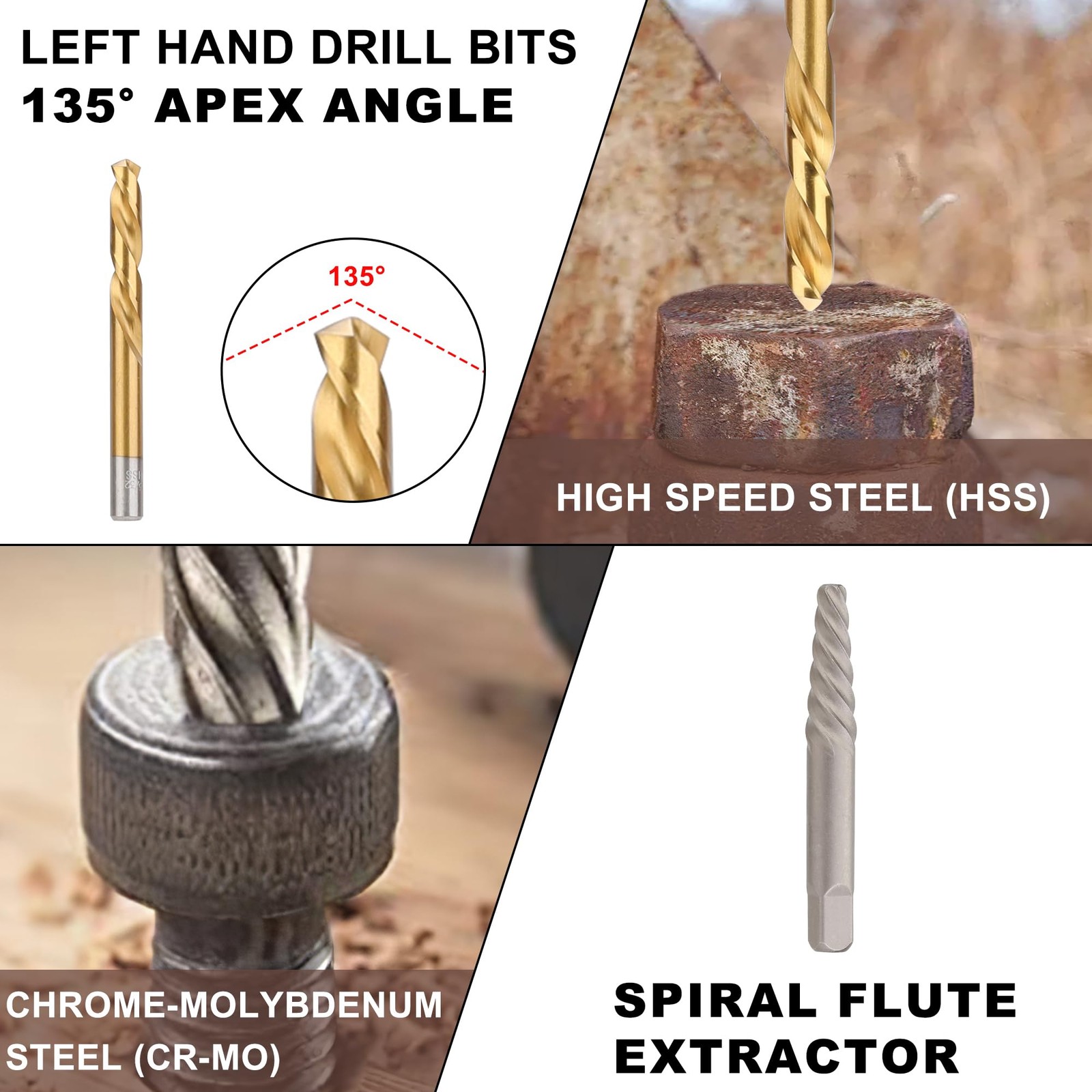 4-in-1 screw&bolt remover kit includes 13pcs most commonly used multi-spline screw extractors ,16pcs tough left hand cobalt drill bits, 6pcs spiral screw extractors 13pcs most commonly used bolt extractors and and 1pcs extension bar. 4-in-1 Screw & Bolt Remover Kit - includes 13pcs most commonly used multi-spline screw extractors ,16pcs tough left hand cobalt drill bits, 6pcs spiral screw extractors 13pcs most commonly used bolt extractors and and 1pcs extension bar. APPLICATION - Suitable for removing most damaged, frozen, rusted fasteners including bolts, nuts and screws. Equipped with bolt/nut busting power, this bolt extractor is ideal for freeing up various nuts and bolts that have gotten stuck. HIGH QUALITY - All the bolt&screw extractors are made of high hardness chrome-molybdenum steel(CR-MO) for high hardness and great toughness ,this material features higher strength than chrome vanadium steel. The left hand cobalt drill bit is made of high speed steel (HSS) with titanium coating for capability and durability. 2 TYPES SCREW EXTRACTORS - Made of Cr-Mo. 13PCS multi-spline extractors match the size of the drill bits are useful for higher torque and lower profile tools, spinning out partly-exposed damaged fasteners. 6PCS Spiral extractors provide extra help to reach deeper places for bolts and screws remove. Easy to use based on drill space with hand or pneumatic tool. CONVENIENT STORAGE & SELECTION - All the removers are placed in a storage case to prevent damage in transit and easy to carry when you are outside. The bolt remover set has laser-etched size markings for easy visibility and size selection.