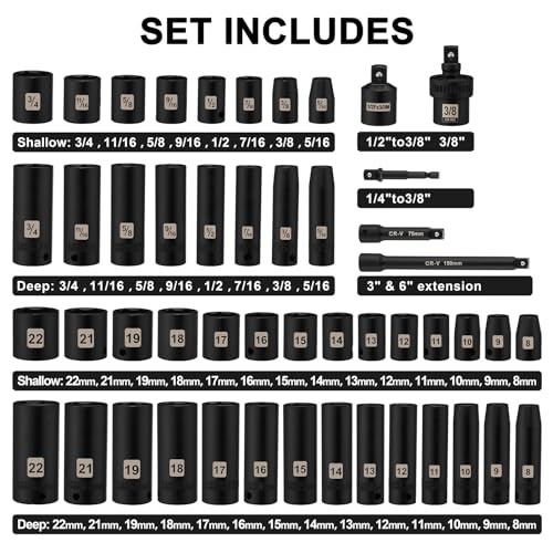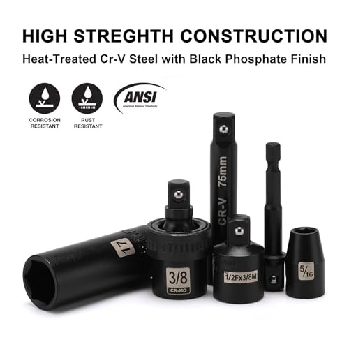 This impact socket set is a game-changer! The variety of sizes covers all my needs, and the included extension bars, adapter, and universal joint make it super versatile. The chrome-vanadium steel feels sturdy, and the 6-point design grips bolts securely. Perfect for DIY projects or professional use—great value for the price! Arrived quickly, and everything fits snugly on my impact wrench. Highly recommend!