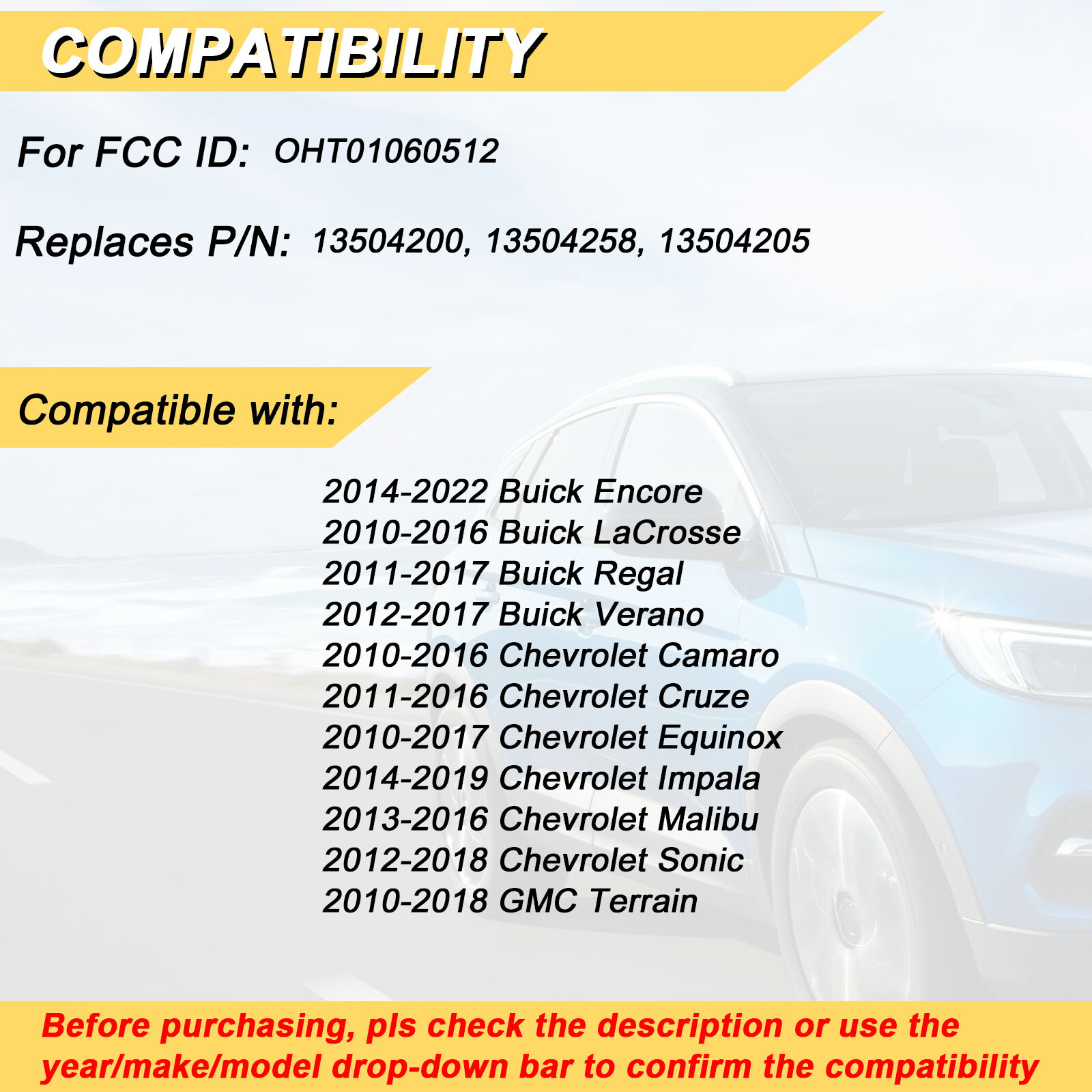 【 Description】 Your premier destination for all your automotive remote control needs. We proudly offer a comprehensive range of high-quality car remotes. Experience the convenience, reliability, and peace of mind that Fangcai0404 has to offer. Discover why we're the trusted choice for automotive remote control solutions. 【Specif ication 】 Condition: 100% Brand New FCC ID: OHT01060512 Warranty: Lifetime Color: Black Button Quantity: 4 Features: Lock, Unlock, Trunk release, Panic alarm Remote Type: Wireless Key Ring Included: Yes Housing Material: Plastic Programming: Online Programming instruction provide Key fob Type: Aftermarket Key Fob Frequency: 315 MHz Battery: CR2032 On Board Programming: No Reusable: (note for car locksmiths and dealers): Used remotes are reusable after unlocking / re-flashing service 【 Comp atibility 】 * Compatible with 2014-2022 Buick Encore * Compatible with 2010-2016 Buick LaCrosse * Compatible with 2011-2017 Buick Regal * Compatible with 2012-2017 Buick Verano * Compatible with 2010-2016 Chevrolet Camaro * Compatible with 2011-2016 Chevrolet Cruze * Compatible with 2010-2017 Chevrolet Equinox * Compatible with 2014-2019 Chevrolet Impala * Compatible with 2013-2016 Chevrolet Malibu * Compatible with 2012-2018 Chevrolet Sonic * Compatible with 2010-2018 GMC Terrain 【 Note 】 1. Ensure that the key fob you receive looks identical to your original remote, as any variation may lead to compatibility issues. 2. Self-Programming is Not Available, it's necessary to be cut and programmed by a qualified dealer or locksmith. 3. It Doesn't Support vehicles with Passive Entry Passive Start (Also Called PEPS, Push Button Ignition, Smart Key or Proximity System) 4. Please note that the key you receive will NOT have a logo on the back. 【Package 】 1pcs Key Fob