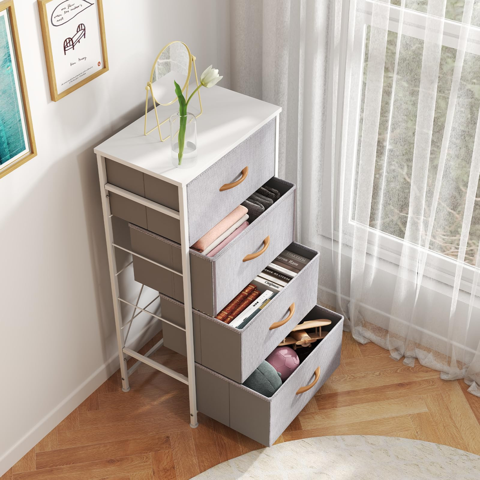 Please pay attention that it is a small dresser with dimensions of 17.7" L x 11.7" W x 36.4" H, which is designed for small spaces Multi-scene Application: This 4 drawers dresser is designed in a modern concise style, which is attractive and functional, making it suitable for any room. It can be a storage dresser in the bedroom or a side table in the living room, also great for closets, nurseries, entryways, hallways, offices, playrooms, children's room and more Sufficient Storage Spase: Features foldable storage drawers. Each fabric drawer (NOT WOOD) offers large storage space, perfect for organizing clothes, toys, socks, underwear, scarves, blankets and other accessories. The drawers are made of High-quality non-woven fabric drawers is easy to clean Sturdy Construction: Strong steel frame and water-resistant wood top offer stable support and ensure years of use; Wood top provides hard surface for displaying lamps, clocks, books, glasses etc Adjustable Feet: Flexible adjustable feet can compensate for any irregularities in the floor.Whatever height you prefer, the adjustable feet will meet your needs EASY to Assemble: Detailed instructions and installation video will guide you through a hassle-free installation; All hardware is included in the package so you only need to fasten some screws