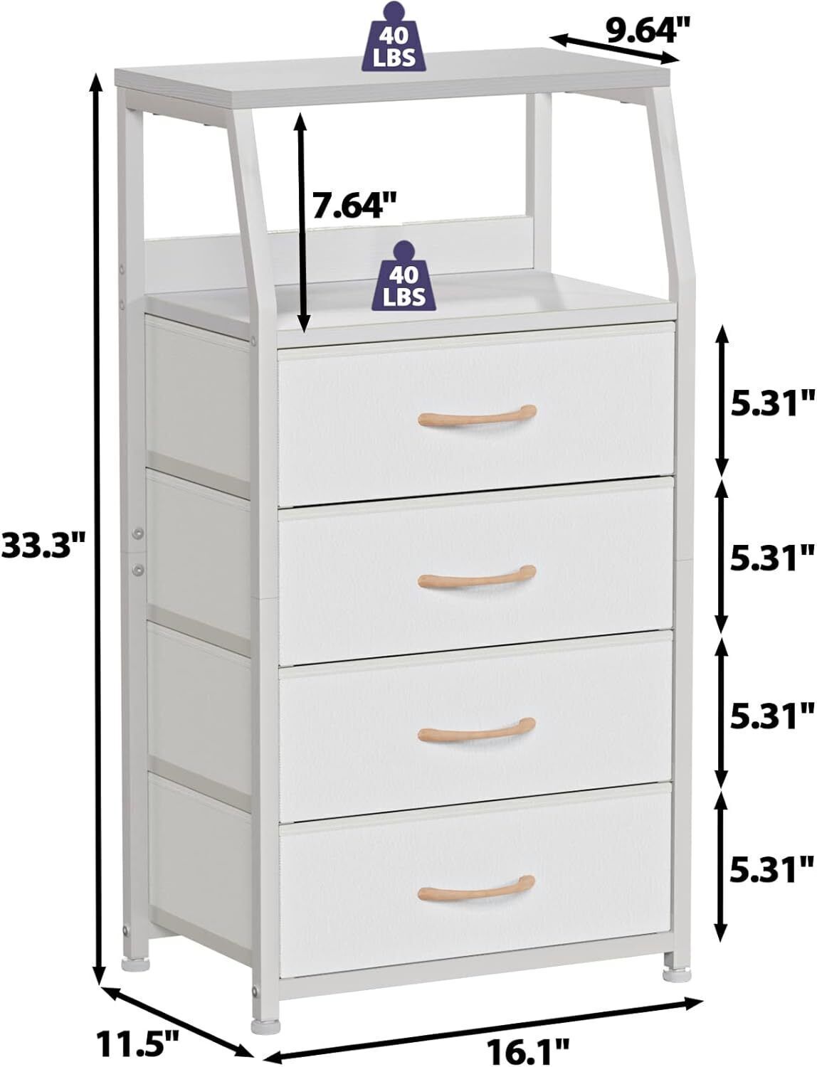 You may also like Pet Dog Sleeping Mattress Edition Dog Bed Pad, Large, 36"x26", Up To 70lbs 40.74 USD 42.88 USD Free shipping 5% off Oscillating Ceramic Electric Tower Space Heater with Remote 1500W Room Office US 66.12 USD 69.6 USD Free shipping 5% off 12-Drawer Fabric Dresser Furniture Storage Tower Cabinet Organizer Living Room 75.85 USD 79.84 USD Free shipping 5% off Blue Medallion 12 Piece Dinnerware Set Dinner Service Set Kitchen Dining Set NEW 61.56 USD 64.8 USD Free shipping 5% off 1.7 gal 500 sq ft Top Fill Cool Moisture Tower Humidifier with Humidistat, White 107.16 USD 112.8 USD Free shipping 5% off Kitchen Dining Fryer 4L Deep Fryer, Stainless Steel, Electric, New, Model 201639 42.73 USD 44.98 USD Free shipping 5% off Christmas Decor Ceramic Round Ceramic and Wood Plant Stand Plant Holder 42.73 USD 44.98 USD Free shipping 5% off 14" X 14" X 11" Round Ceramic Striped Seasons Gloworm Plant Pot W/ Drainage Hole 47.35 USD 49.84 USD Free shipping 5% off Iron Fire Place Wood Storage Log Holder w/Canvas Tote Black (just Rack Include) 64.7 USD 68.1 USD Free shipping 5% off 54" Double Condo Cat Tree with Scratching Post Tower Playing Center, Pink Xmas 75.47 USD Free shipping Kitchen Variety Set of 5 Pantry Organization Canisters with Lids and Labels Xmas 34.41 USD 36.22 USD Free shipping 5% off 36" Mission Plant Stand Indoor Outdoor Plant Display Holder Stand Rack 67.58 USD 71.14 USD Free shipping 5% off About this item 【 Multi-scene Application 】 This nightstand is designed in a modern concise style, which is attractive and functional, making it suitable for any room. It can be a storage dresser in the bedroom or a side table in the living room, also great for closets, nurseries, entryways, hallways, offices, playrooms, children's room and more. 【 Double Display Shelf 】 Specially designed with the double-layer shelf. The wooden top is solid and wear-resistant. It can display vases, photo frames, lamps, decorations, etc. Or it can be used to place glasses, alarm clocks, books, chargers and other sundries, which is not only convenient and practical but also artistic as a decor. 【 Durable Storage Drawer 】 Features foldable storage drawers. Each fabric drawer (NOT WOOD) offers large storage space, perfect for organizing clothes, toys, socks, underwear, scarves, blankets and other accessories. The drawers are made of PVC fabric, lightweight and durable, and won't pinch hands, also safe for child to use. 【 Sturdy Structure 】 The chest of drawer is made with sturdy metal frame, which offers high strength support and ensure years of use. The overall frame is stable, and it weighs only 13.5 pounds, isn ’ t bulky and easy to move. Anti-toppling device is provided to prevent it from falling down. Fully guaranteed stability and safety. 【 Easy to Assemble 】 The package includes all the tools and accessories, you can install it with the instruction. The wood dresser is slim and light, and does not take up much space. Perfect Gift for a housewarming or your family and friends. Overall dimension: 11.5"D x16.1"W x 33.3"H Compact Adjustable Powder Coat Metal Laundry Storage Drying Rack Stand, White 81.95 USD 86.26 USD Free shipping 5% off 12 Piece Set Dinnerware Blue Marble Stoneware Microwave Safe Dishes Set for 4 61.56 USD 64.8 USD Free shipping 5% off 4-Cube Storage Organizer Cabinet Wood Shelf Cabinet Bookcase Display Home Office 79.62 USD 83.81 USD Free shipping 5% off Xmas Living Room Traditional Leaf Block Aqua Gray Print Indoor Area Rug, 5' X 7' 61.85 USD 65.11 USD Free shipping 5% off 22 Gallon Small Resin Outdoor Patio Pool Kids Toys Garage Storage Deck Box 33.24 USD 34.99 USD Free shipping 5% off Living Room Furniture End Table Bedroom Side Table Nightstand with Door Cabinet 71.57 USD 75.34 USD Free shipping 5% off 3-Piece Chenille Duvet Cover Set, Queen Size Christmas Decor Duvet Cover, White 60.42 USD 63.6 USD Free shipping 5% off Retro Tabletop Heater Room Office Tabletop Heating Portable Cream & Brass Finish 61.56 USD 64.8 USD Free shipping 5% off Multi-Surface Total Pet Bagless Upright Vacuum Cleaner Hard Floor Cleaner New 112.86 USD 118.8 USD Free shipping 5% off Christmas Gift 1500W Oscillating Ceramic Tower Electric Space Heater with Remote 47.46 USD 49.96 USD Free shipping 5% off 2023 20V Cordless 1/2 In Drill Driver Kit with 2.0 Ah Lithium Battery & Charger 142.5 USD 150.0 USD Free shipping 5% off 54" Double Condo Cat Tree with Scratching Post Tower Playing Center, Pink Xmas 75.47 USD Free shipping