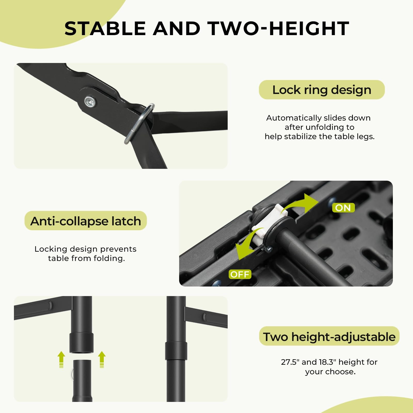 1 [Stable and Anti-slip]: The table legs are designed with anti-slip rubber pads, which can effectively enhance friction with the ground. Even when used on smooth tiles or outdoor grass, it can reduce shaking and improve safety during use. [Rounded Edges]: The edges of the tabletop are rounded to avoid damage caused by bumps from sharp corners, making it especially suitable for families with children or reducing the risk of accidents in places with heavy foot traffic. [Strong Weather Resistance]: In addition to being waterproof and heat-resistant, the tabletop material can also resist daily stains, minor scratches, and ultraviolet radiation. It is not easy to fade or deform when exposed to outdoor environments for a long time, thus extending its service life. [Quick to Unfold]: The folding structure is reasonably designed, making the unfolding process simple and convenient. No complicated installation steps are required, and a single person can complete the setup in a short time, meeting the demand for quick use in temporary scenarios. [Wide Applications]: This versatile table has a large tabletop, making it suitable for various activities. It can be used indoors for dining, games, handwork, and studying. Outdoors, it is perfect for parties, picnics, camping, weddings.