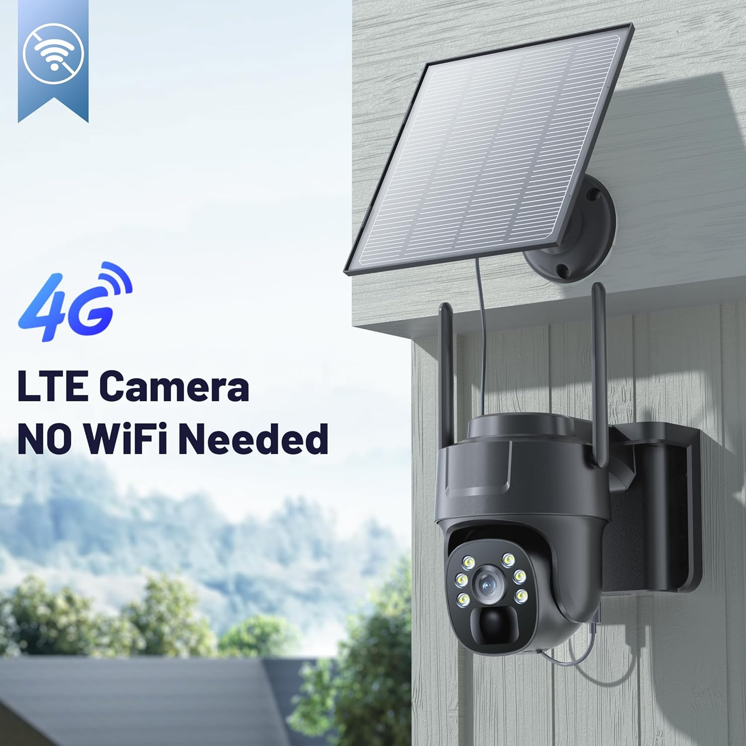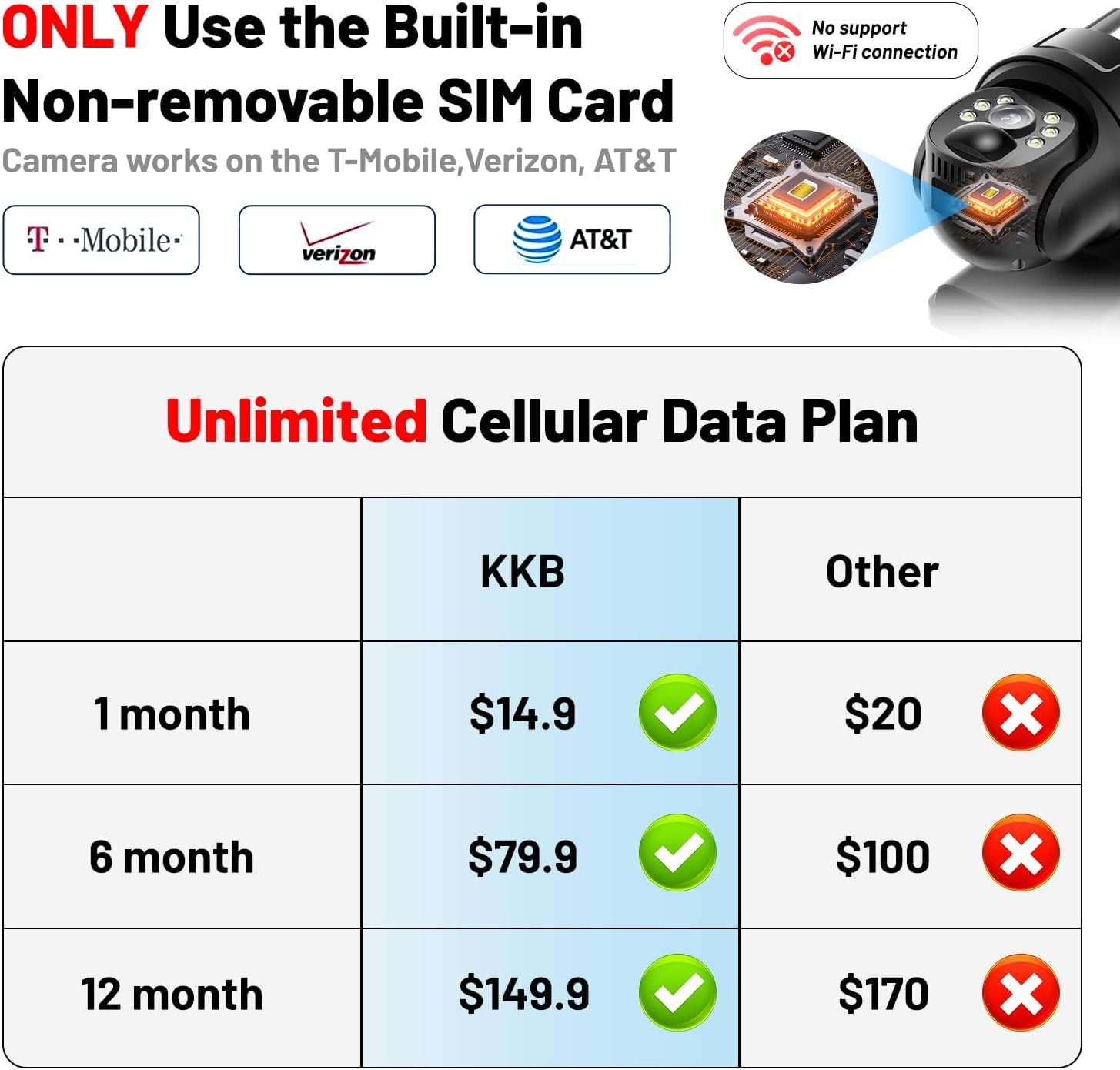 【4G LTE Network & No WiFi】The cellular security camera is designed specifically for use in places without a network or even wires, making it ideal for country houses, construction sites, etc. (No WiFi support) 【Unlimited Data & Live Viewing】KKB 4G LTE Security Camera only supports the built-in SIM card (non-replaceable) to connect to Verizon, T-Mobile, and AT&T's 4G cellular network to ensure compatibility and stability. 300MB prepaid data is provided for connecting the camera. Data plans are renewable within the app at 14.9 USD/month, 79.9 USD/6 months, 139.9 USD/year. Enjoy unlimited data any time you want to watch 【Solar Powered & Wireless】This solar security cameras wireless outdoor camera has a 10400 mAh battery built in to provide continuous power for wireless outside cameras with 5W high conversion rate solar panels 【PIR Detection & 2K Color Night Vision】With a sensitive PIR sensor, this camera can quickly and accurately detect any movement of a person or an animal, and then instantly push notifications to you via the mobile app, and with its 2K image quality and colorful night vision (infrared night vision is provided for low light), your assets will always be protected, even at night 【2-Way Audio & 360° View】With this feature, you can talk to any visitor even if you're not at home, and you can adjust the angle of the security camera's shot to see a wider field of view Product Description Color Night Vision Two Way Audio PIR Motion Sensor The cellular camera will send an alert message to the cell phone when it detects humanoid movement. SD Card Storage SD card for video storage, supports Max 128GB (not included) Solar Powered Outdoor wireless great choice, solar power provides continuous power to the camera. 1 PIR 2 SD Card Storage 5 Solar Powered Multiuser Use Support multi-user sharing of 4G camera videos and services. IP66 Waterproof Outdoor cameras are highly weather resistant and can work in bad weather. 1 Multiuser Use 2 IP66 Waterproof Can I use this cellular camera in other countries? No, the camera is only supported for use in the United States. Networks in other countries or regions are not compatible. Do I need to buy the data plan? Yes, a data plan connection to the network is required for the 4G LTE camera to work during use. The built-in SIM card offers an unlimited data plan that is automatically compatible with AT&T, T-Mobile, and Verizon networks. Does each camera use its own separate data plan? Yes, each camera needs to have a separate data plan in order to work, you can't have one data plan for multiple different cameras. Can this camera connect to WiFi? No, it can only use 3G/4G LTE to connect to the network.