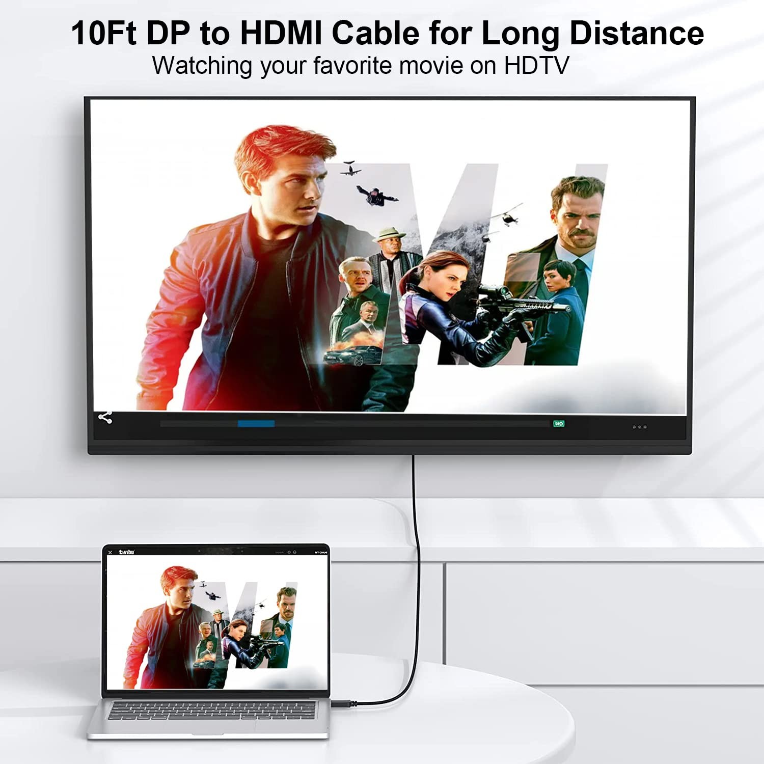 DisplayPort to HDMI Cable 10 Feet 【Compact Structure】Exclusive design, compact, simple and fashionable, perfect for use with multi interface laptop and desktops. With its extra-long 10ft reach, you get the freedom to organize your space without compromising signal quality 【4K Universal Display Compatibility】Extended Desktop mode and Mirrored Display mode are make you better entertainment experiences from a small or old computer. Support high video industry-leading 4K UHD (3840×2160) @30Hz clarity with multi-format support, including QHD (2560×1440) @60Hz and Full HD (1920×1080) @120Hz for universal display compatibility. 【Attribute】Convenient DisplayPort to HDMI cable directly connects a DisplayPort (DP, DP++, DisplayPort++) output equipped computer to an HDTV, monitor, or projector with HDMI input(This is unidirectional,Only convert signal from DP to HDMI, but can't HDMI to DP) 【Premium Material & Durable and Flexible】No Flicker. No Blackouts. Just Flawless Visuals: By engineering a premium cotton-braided jacket (more durable and flexible than standard nylon), alongside UL 20276-certified construction, gold-plated contacts, pure bare copper conductors, and layered foil+braid shielding, we guarantee superior cable stability and interference-free transmission. For silky-smooth gaming, razor-sharp work, or cinematic depth—this is HD without limits. 【Support Advanced System】Windows7, 8, 8.1, 10, Chrome OS, MacOS High Sierra 10.13.4 or higher and backward compatible 【Please Note 】This DisplayPort to HDMI Cable not HDMI to DisplayPort Cable. Can only transmit signal from DisplayPort Computer to HDMI Monitor. Keep your Computer with DP Port not HDMI Port.