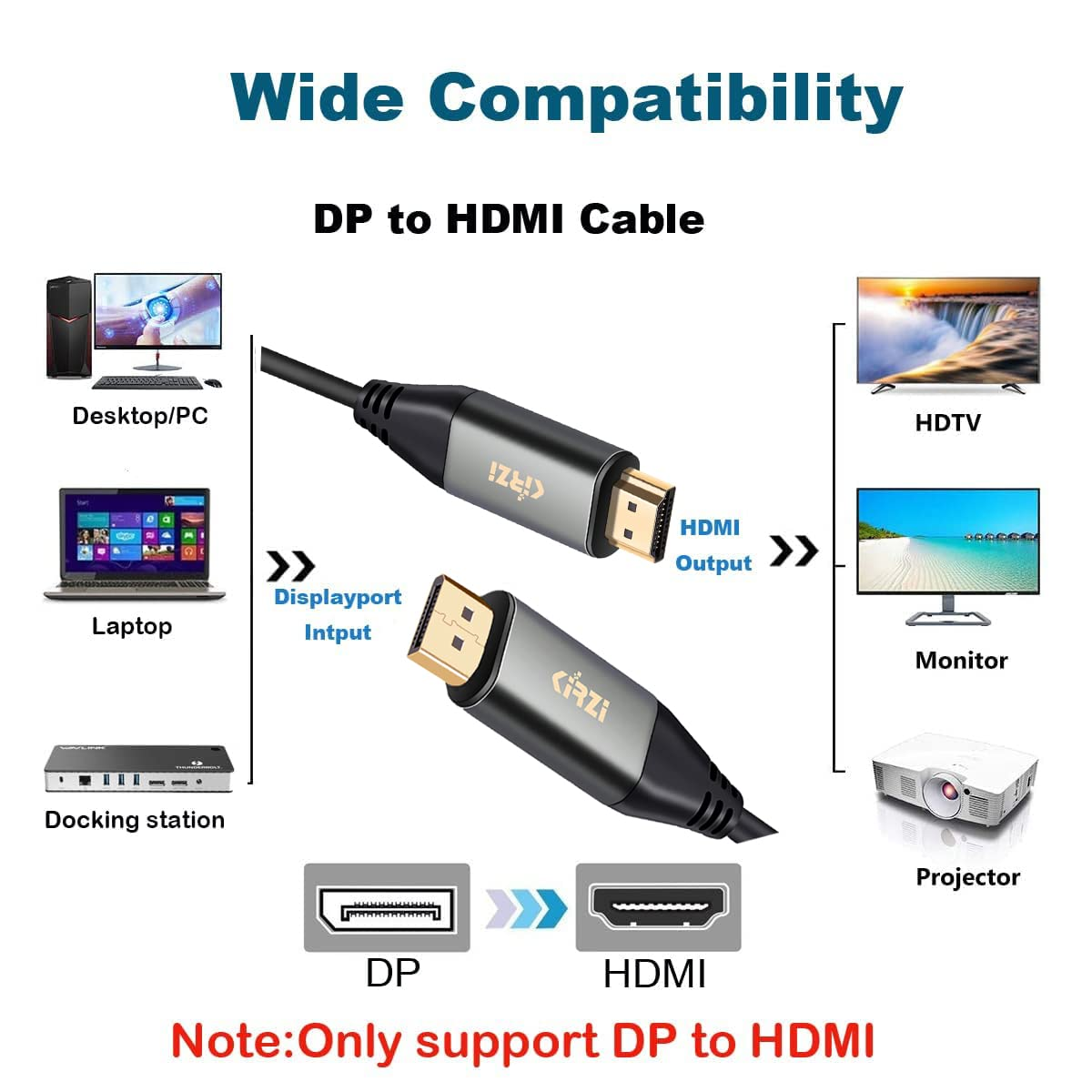 (Note: Unidirectional ) DisplayPort to HDMI cable directly connects a Display Port (DP, DP++, DisplayPort++) equipped computer to an HDTV, monitor, or projector with HDMI input Extended Desktop model and Mirrored Displays model are make you better entertainment experiences from a small or old computer.Suitable for playing game, enjoy home theater, having a report Compatible with DisplayPort equipped computer, pc, notebook, ultrabook, HP, Lenovo, Dell, ASUS,AMD and other brands; Transmits high-definition audio and video from your computer to an HDTV for video streaming or gaming;Supports video resolutions up to 3840*2160 / 4K@60HZ and uncompressed digital 7.1, 5.1 or 2 audio channels. DP-HDMI Cable Latch-free design helps you plug&unplug it easily without damaging the port. Slim shell size frees you from the worry of getting in the way of nearby ports. Product Description High-Speed 4K DP to HDMI Cable High-Speed 4K DP to HDMI Cable · Enjoy the 4K video that your computer and a 4K display can offer · Supports 4K(3840 x 2160)@60hz PHD , 1080P@120hz Full HD · Experience the deep color depths and sharp images · DisplayPort audio support for a full range of digital multi-channel audio · Multiple lengths to choose from, perfectly suited for home or office How to Use this Uni-Directional DisplayPort to HDMI Cable? How to Use this Uni-Directional DisplayPort to HDMI Cable? · This is a Passive cable, not Active. If you want to connect it with a DP dock/hub/KVM, please check whether the device supports dp++. * Docking stations/hubs that do not support dp++ need to use an Active adapter/cable · Uni-directional. Only from a graphics card with DisplayPort to displays with HDMI, thus cannot support PCs that do not have DisplayPort (e.g. Apple products) wide range of application scenarios wide range of application scenarios · 4K DisplayPort cable to HDMI male to male cord provides a cost-effective and easy solution for connecting a computer, desktop, laptop, or other devices with Display Port to HDMI Port display such as monitor, projector or TV, which is your preferred choice for seamless gaming, video streaming or extending a workstation.