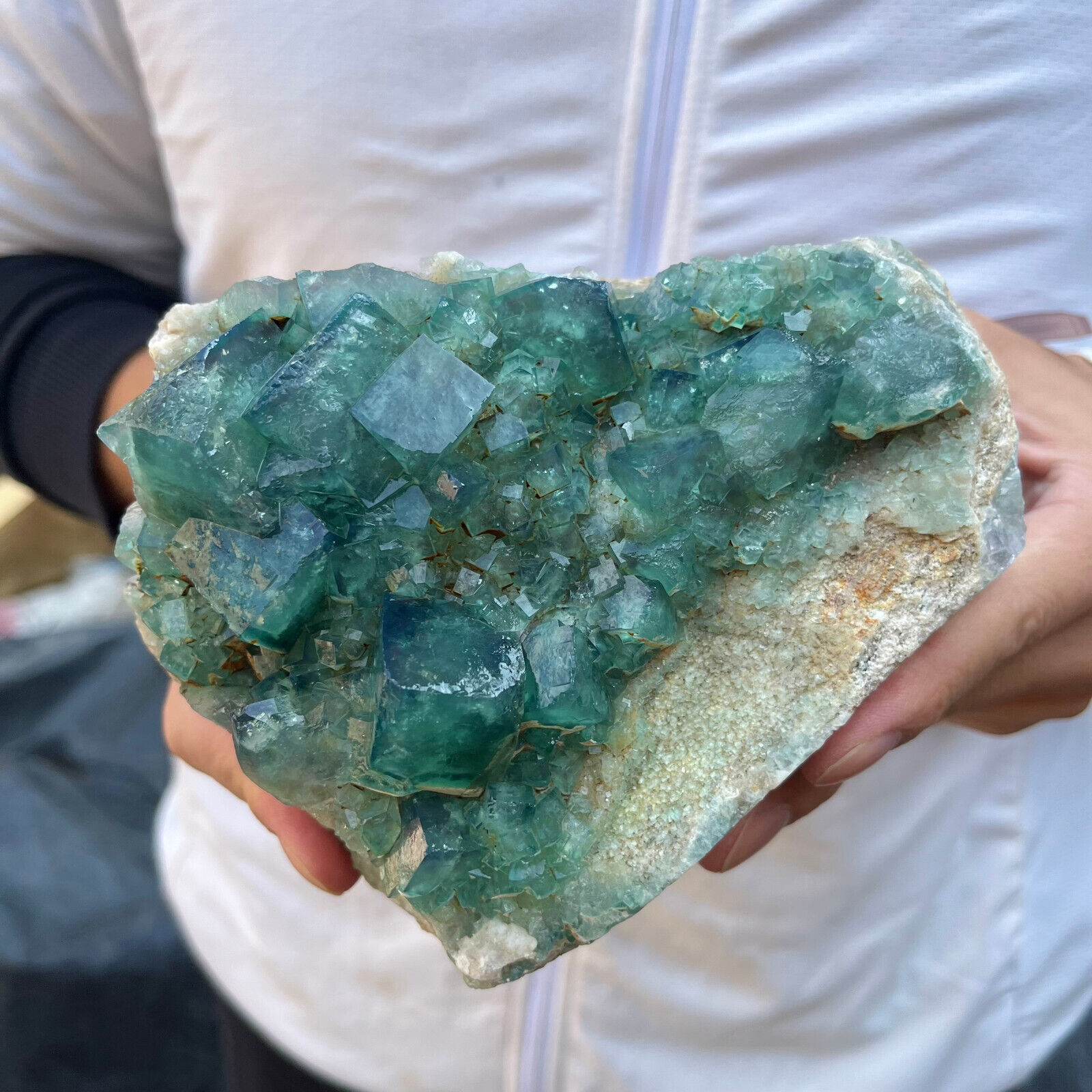 Amazing blue green hues in the fluorite. Item got here super quickly and it was wrapped completely in bubble wrap and tape. It looks exactly like the picture. It’s a solid chonk of a rock with interesting white flecks of crystal on the bottom. A+ transaction!!!