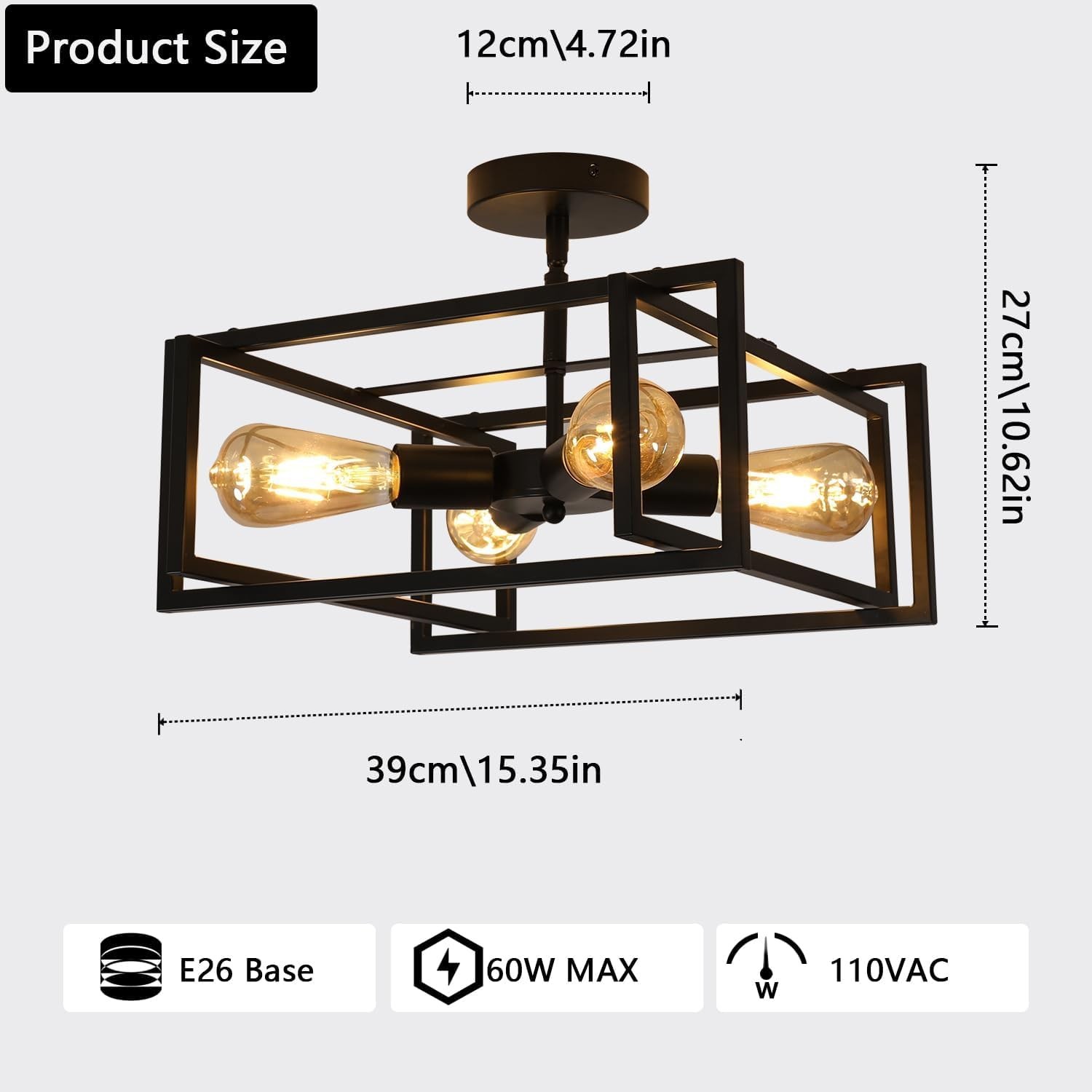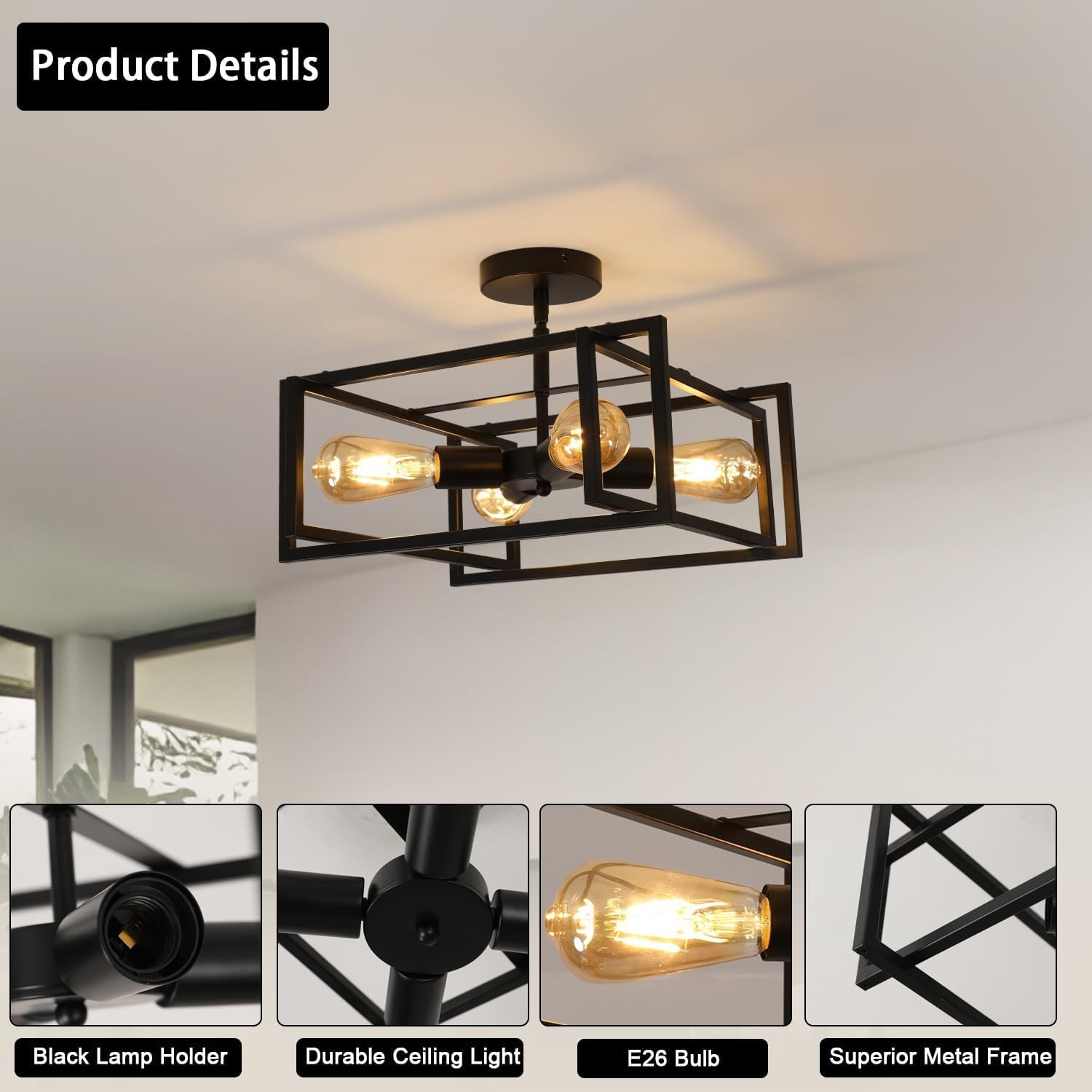 4-Lights Close to Ceiling LightBlack Light Fixture Industrial Farmhouse Flush Mount Ceiling Light ใ๐๐จ๐๐๐ซ๐ง ๐๐๐ข๐ฅ๐ข๐ง๐ ๐๐ข๐ ๐ก๐ญ ใ This farmhouse semi flush mount ceiling light features a sleek black square metal frame design, combining farmhouse charm with industrial aesthetics. Perfect for adding a touch of modern elegance to any space ใ๐๐ฎ๐ฅ๐ ๐๐ฒ๐ฉ๐ใBlack Ceiling Light Fixture fits all E26 lamp holder bulb. Such Ts Edison bulbs, LED, energy-saving, and incandescent bulbs. You can choose dimmable bulbs and compatible dimming switches to create a variety of dimming atmospheres. (Bulbs and Dimmer excluded) ใ๐๐๐๐๐ฅ ๐๐ฉ๐ฉ๐ฅ๐ข๐๐๐ญ๐ข๐จ๐งใThis modern farmhouse light is ideal for various rooms, including kitchens, dining rooms, living rooms, bedrooms, and even hallways. Its versatile design complements both rustic and contemporary decor styles ใ๐๐๐ฌ๐ฒ ๐ญ๐จ ๐๐ง๐ฌ๐ญ๐๐ฅ๐ฅใThis ceiling light comes with necessary installation hardware and a detailed installation manual, making it easy to assemble in just a few steps, making it a hassle-free upgrade for your home lighting ๏ปฟ ใ๐๐๐ญ๐๐ซ ๐๐๐ฅ๐๐ฌ ๐๐๐ซ๐ฏ๐ข๐๐ใCustomer satisfaction is our top priority. If you have any questions, please us and we will get back to you within 12 hours