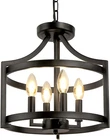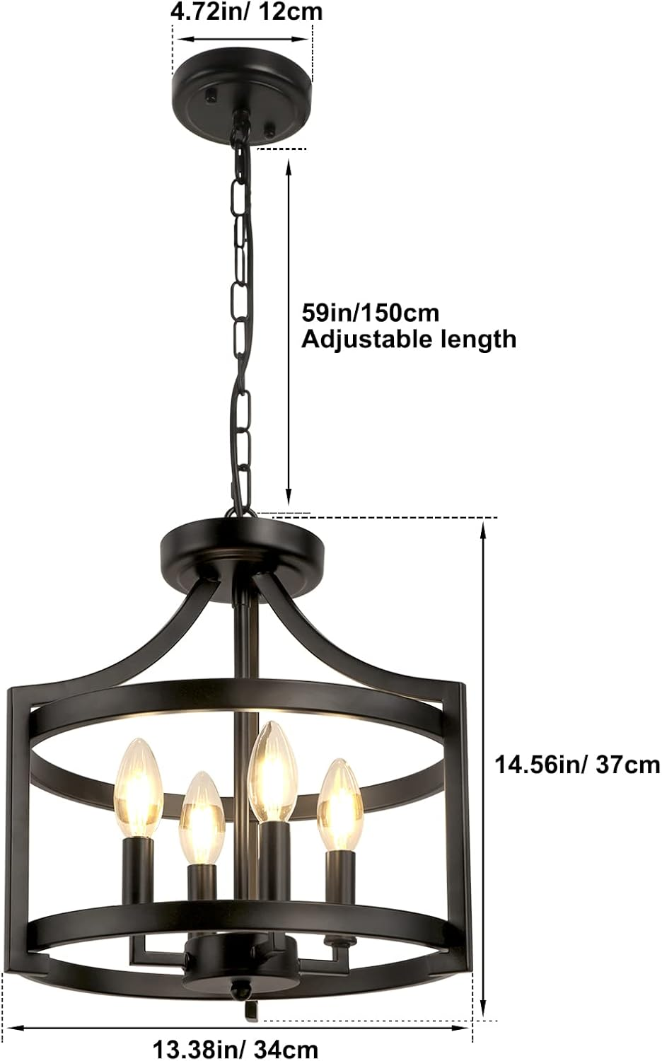 Modern Farmhouse Style: This semi flush mount ceiling light features 3 anchor frames connecting 2 rings and a candle-shaped lamp holder, simple fashion open-cage frame with matte black finish design for a modern farmhouse look, adds elegance and rustic charm to your space. Convertible and Height Adjustable: With a removable 59'' chain, you can choose to hang it as a pendant or mount it flush with ceiling. Width diameter: 13.38'', Height: 14.56''-73.56'', you can adjust the hanging height as your need. Installation: The black chandelier light fixture is packaged piece by piece, need to assemble. It comes with necessary accessories and instructions to install quickly and easily, you also can refer to our installation video to install. It can be installed on the flat, sloped, slanted, or vaulted ceiling. Bulb Requirement: Requires 4 x E12 bulb, Max 60W. Compatible with LED, Edison, CFL, incandescent, and halogen bulbs. The open design can maximize the illumination and easy to replace the bulbs. Fully dimmable when used with dimmable bulbs and a compatible dimmer switch. (Bulbs and Switch NOT Included) Wide Application: This 4-light farmhouse light fixtures either as a ceiling light fixture or a hanging light, is great for kitchen, dining area, living room, bedroom, foyer, entryway, hallway. Product Description WBinDX Farmhouse Semi Flush Mount Ceiling Light Fixture, Convertible Hanging Pendant Light Crafted of metal in painted black finish and 4 candlesticks, simple open-cage frame with classic candle-style arm design adds rustic flair and fashion charm to your space, fits right into traditional abodes and modern farmhouses alike. It comes with a removable chain, either as a semi flush mount ceiling light or a hanging pendant light. WBinDX 4-Light Black Farmhouse Chandelier This small black chandelier is suitable for any style, modern, farmhouse, rustic, industrial, or vintage. Great for as a dining room light fixture, living room chandeliers, bedroom ceiling light, kitchen island pendant lighting, hallway entryway light fixture, foyer chandelier and stairwell lighting. Specification: Number of Lights: 4 Color: Matte Black Material: Metal Iron Voltage: 110-120V Hanging Light Size: 13.4"(D)x14.6~73.6"(H) Ceiling Light Size: 13.4"(D)x14.6"(H) Adjustable Height: Comes with 59'' hanging chain UL Listed: Sockets and wires are UL listed Features: Open cage design Hanging & semi flush mount design Height adjustable Easy to install. Includes all mounting hardware Installable on flat, sloped, slanted or vaulted ceiling Dimmable when using dimmable bulbs and compatible dimmer switch Compatible with variety of E12 based bulb Sockets: E12 bulb sockets Max of one bulb is 60 watts Works with LED, Edison, incandescent, halogen, CFL bulbs Recommended work with candle-style Edison bulb It can be dimmable when used with dimmable bulb and compatible dimmer switch NOTE: Bulbs and Switch Not Included Hanging or Ceiling Mounted With a removable chain, it could be installed as a semi flush mount ceiling light or hung as a pendant. Works with flat, sloped, slanted, or vaulted ceilings. Fully Adjustable Chain This farmhouse chandelier provides a fully adjustable 59 inches chain, you can adjust the hanging height between 14.6 inches to 73.6 inches. Cup-less Candle Holders Classic unique cup-less candle base adds a modern yet elegant, industrial vintage flair to space, is a focal point in your home decor. Matte Black Finish The kitchen light fixtures crafted of high-quality metal in a painted black finish create a modern farmhouse look, more textured and more sturdy. When As Semi Flush Mount Ceiling Light: When As Hanging Pendant Light: Note: 1. Preferably install it by an electrician. 2. Please cut off the electricity supply when installation. 3. Please cut off the electricity supply when clean or change the bulbs. 4. Please use it in a dry environment for longer service life.