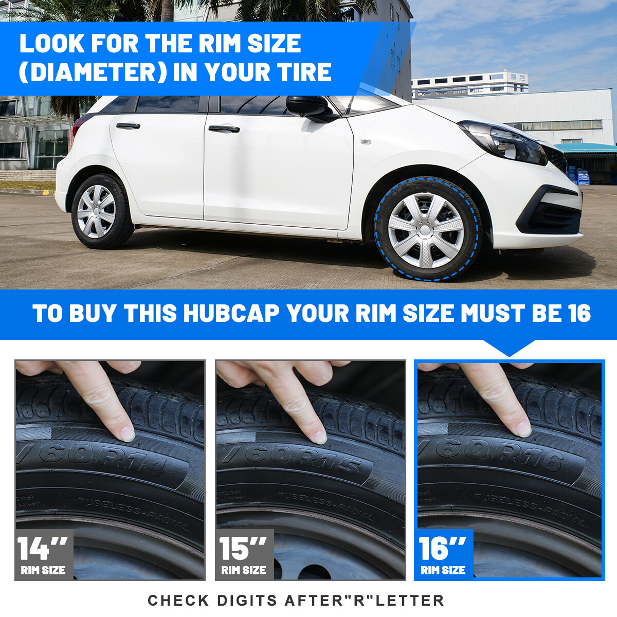 Head Lights Tail Lights Fog Lights Turn Signal Bumper Fender Flare Inner Fender Hubcaps Refrigerator Other Items for sale Head Lights Tail Lights Fog Lights Turn Signal Bumper Fender Flare Inner Fender Liners Portable Refrigerator Description This set of 4 wheel covers easily installs over your existing factory steel wheels in minutes! These wheel covers are constructed from durable, automotive grade plastic and feature an attractive silver finish for a custom look. Feature Set of Silver & Mould Texture Wheel Covers. To Buy This Hubcap Your Rim Size Must Be 16". The high-quality manufacturing process can prevent the product from cracking, fading and powdering. Made of high-quality hard and durable ABS plastic, which is strong and durable. Hubcaps have the A grade retention ring. It won't come off while driving as long as the hubcaps are installed properly High quality Flexible ABS material Adjustable buckle design. NOTICE: Just fit for ironhub,Not for aluminium alloy hub! Please check the hubs before purchasing! Package include: 4× Wheel Hubcaps Covers