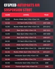 *Compatibility Chart 1, You can distinguish specific model of an automobile by VIN(Vehicle Identification Number). 2, VIN(Vehicle Identification Number) consists of total 17 English letters and arabic digits. 3, VIN does not include the letters I (i), O (o), and Q (q) (to avoid confusion with numerals 1 and 0). 4PCS Front & Rear Air Suspension Shock Strut For Mercedes W164 GL550 GL450 ML320 *Compatibility Chart 1, You can distinguish specific model of an automobile by VIN(Vehicle Identification Number). 2, VIN(Vehicle Identification Number) consists of total 17 English letters and arabic digits. 3, VIN does not include the letters I (i), O (o), and Q (q) (to avoid confusion with numerals 1 and 0). Mercedes-Benz GL-Class( With Adaptive Damping System ) GL320 Bluetec 4Matic Sport Utility 4-Door 3.0L 2009 GL320 CDI Sport Utility 4-Door 3.0L 2007-2008 GL350 Bluetec 4Matic Sport Utility 4-Door 3.0L 2010-2012 GL450 Base Sport Utility 4-Door 4.6L 2007-2012 GL450 Base Sport Utility 4-Door 4.7L 2007-2009 GL550 Base Sport Utility 4-Door 5.5L 2008-2011 Mercedes-Benz M-Class ML320 CDI Sport Utility 4-Door 3.0L 2007-2008 ML350 4Matic Sport Utility 4-Door 3.5L 2006-2011 ML350 Base Sport Utility 4-Door 3.5L 2006-2007 2009-2011 ML350 Bluetec 4Matic Sport Utility 4-Door 3.0L 2010-2011 ML350 Introduction Sport Utility 4-Door 3.5L 2006 ML350 Lujo Sport Utility 4-Door 3.5L 2008-2009 ML350 Premium Sport Utility 4-Door 3.5L 2006 ML350 Sport AMG Sport Utility 4-Door 3.5L 2010-2011 ML350 Sport AMG Sport Utility 4-Door 5.5L 2010-2011 ML450 Hybrid 4Matic Sport Utility 4-Door 3.5L 2010-2011 ML500 Base Sport Utility 4-Door 5.0L 2005-2007 ML500 Introduction Sport Utility 4-Door 5.0L 2006 ML500 Premium Sport Utility 4-Door 5.0L 2006 ML500 Special Edition Sport Utility 4-Door 5.0L 2005 ML550 Base Sport Utility 4-Door 2008-2011 If you need to any other air suspension shock strut( With Adaptive Damping Sensor ) please click > Front Left/Right Air Suspension Struts please click > Front Pair air Suspension strut please click > Rear Left/Right air suspension strut please click > Rear pair air Suspension Struts please click > Front Pair Air Suspension St ruts+ air S uspension Compressor please click > air Suspension Compressor please click > Front Rear air suspension Struts + Air Suspension compressor If you need to any other air suspension Shocks Struts( Without Adaptive Damping Sensor ) please click > Front Left/Right Air Suspension Struts please click > Front Pair Air Suspension Struts please click > Rear air suspension strut please click > Rear pair air Suspension Struts please click > Front Pair Air Suspension St ruts+ air S uspension Compressor please click > Front Rear air Suspension Struts please click > air Suspension Compressor If you need to any other air suspension Spring ( Mercedes M-Class W164 GL-Class X164 ) please click > Front Air Suspension Springs please click > Front Pair air Suspension spring please click > Rear air suspension s pring please click > Rear pair air Suspension Springs please click > Front Pair Air Suspension St ruts+ Front Pair Air Suspension Springs ( Without Adaptive Damping Sensor ) please click > Front Pair Air Suspension St ruts + Front Pair Air Suspension Springs ( With Adaptive Damping Sensor ) please click > Front Rear air Suspension Springs please click > Rear Pair Air Suspension Struts + Rear Pair Air Suspension Springs ( With Adaptive Damping Sensor ) please click > Front Pair Air Suspension Struts + Rear Pair Air Suspension Springs ( Without Adaptive Damping Sensor ) please click > Front Pair Air Suspension Struts + Rear Pair Air Suspension Springs ( With Adaptive Damping Sensor ) please click > Front Pair air suspension Springs + Air Suspension compressor please click > Rear Pair air s uspension Springs + Air Suspension compressor please click > Front Rear air suspension Springs + Air Suspension compressor * Generation & Evolution: Mercedes-Benz GL-Class X164 First generation (2007-2012) X166 Second generation (2013-present) Mercedes-Benz M-Class W163 First generation (1997-2005) W164 Second generation (2005-2011) W166 Third generation (2011-2019) W166 Sport Utility C292 Coupé Version W167 Fourth generation (2019-present) *Platform Drive Layout : Base Model-Rear Wheel Drive Layout 4Matic Model -Four Wheel Drive Layout *Features and Benefits: Made of high quality raw materials, effectively reduce air leakage, strong sealing All parts are hand inspected off the line before packaging and once again by our team before shipment. According to the original factory specifications. Perfect match for the original car. Easy installation. Stable characteristics, high reliability. Aftermarket Products with Premium Quality. Precisely engineered to absorb shock and vibration from the road Return policy: Enjoy 30 days return and exchange * Frequently Asked Questions : How to prevent the damage of air springs/How to extend the service life of air springs/struts etc.? An air strut with separable air springs If your vehicle offers a separable air suspension (Audi Allroad A6 C5, Mercedes-Benz W164, BMW X5, etc.), you should regularly (about once a week) lift the car to the maximum position, and remove dirt with a high-pressure cleaner (keep the cleaner at a distance to the air spring about 30 cm/12 inches, otherwise water pressure can damage the air spring). The highest position may vary depending on your model and regulation options. Therefore, please test this by trying the different modes available to you (Sport, comfort, dynamic, off-road) and choose the one that sets your vehicle to the highest position. The dirt will most likely be found under the fold of the pneumatic chambers. If you find a frozen layer of bitumen on the piston guide (the part of a strut on which the air spring is installed), it is recommended to clean it as well. Whenever possible, avoid riding on fresh asphalt, as fresh bitumen mixed with sand immediately results in a build-up of abrasives on the piston and in turn con