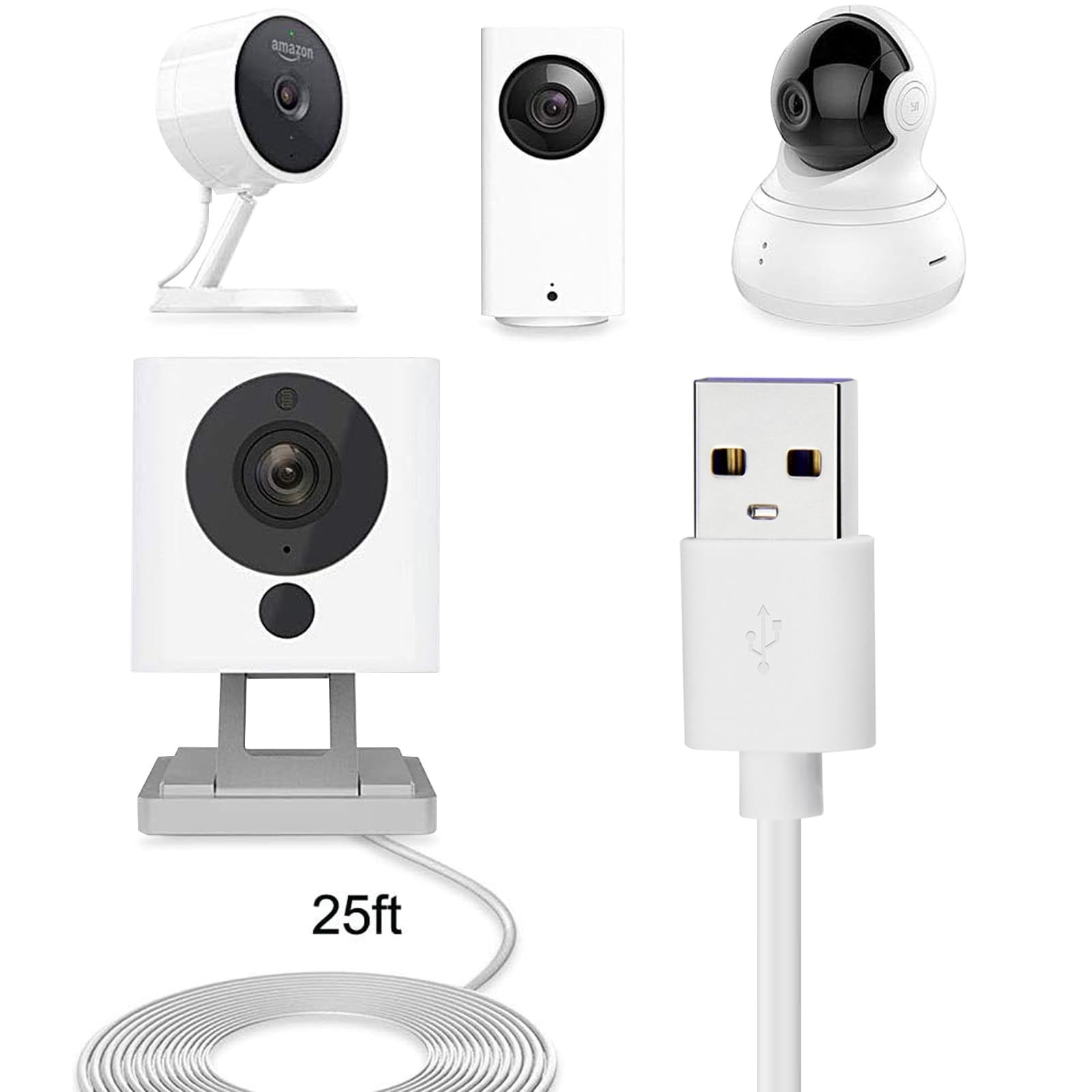 Long micro USB cable made for wireless camera, more convenient and practical Compatible with Wyze Cam Pan, Amazon Cloud Cam, Blink, Oculus Go, Furbo Dog Camera, and many more(USB to Micro USB) Package Include 4*25FT Micro USB Cable 25ft charging cable compatible for Wyze Cam, Wyze Cam Pan, Yi Camera, Oculus Go, Nest Cam, Netvue, Blink, Furbo Dog USB 2.0 to Micro B connectors; supply power to your wireless camera The length of the cord is 25ft (8m), long enough Durable PVC jacket protects wire cores and prevent tangling Extra cables, replace your original charging cable