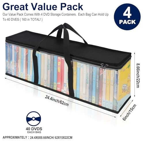 Return Policy Fast Delivery Trusted seller DVD Storage Bags (Set of 4) Clear PVC Media Holder Case with Handles for DVDs/CDs/VHS Box/Blu Ray Disc/Movie Cases/Video Games Discs - Each Bag Holds up to 40 DVDs Product Description PVC 【Premium Quality PVC Storage Bags】Our DVD storage bag is made of durable PVC material, making it perfect for storing DVD cases, movies, VHS tapes, video game controllers, and more. The transparent design allows you to easily find the exact case you're looking for, and show off your collection to your guests. 【Sturdy Handles and Top Zipper Design】Our CD storage bags feature built-in handles with double-stitched seams, making it easy for you to carry and transport your DVDs. And the zippered top and horizontal design makes it simple to open and access your DVD collection. 【Protect Your Collection】Our DVD storage bags arewater resistant, protecting your CDs from moisture buildup. They can also withstand harsh weather conditions like rain, snow, as well as scratches, dust, dirt, and debris. 【Multifunctional Storage Containers】You also can use our PVC carriers to organize recipe and novel series, photo albums, toys, stuffed animals, clothes, blankets, bedding, tablecloths, placemats, holiday decorations, ornaments, and anything else you can think of! It can be placed anyw you want like the living room, bedroom, office, kitchen etc. 【Great Value Pack】Our value pack comes with 4 Pack dvd storage containers. Each bag can hold 30-40 DVDs (may vary depending on the thickness of the case). Dimensions are approximately 23.5” Length x 8” Width x 6” Height. Shipping Returns Payment Shipping Shipping is FREE to all addresses other than APO/PO boxes in the lower 48 states. All our stock ships from US-based warehouses. Shipped via USPS or UPS (depending on location and package weight) Unless stated otherwise, all orders will ship within 24-72 hours of your payment being processed. Check our feedback to see the great reviews of FAST shipping we offer. Returns Seller does not accept returns Payment We currently accept payment via eBay managed payments only. Once payment is cleared, we will dispatch your shipment within 1-3 business days. Please refer to the "Shipping" tab for more information regarding shipping speed to your destination.