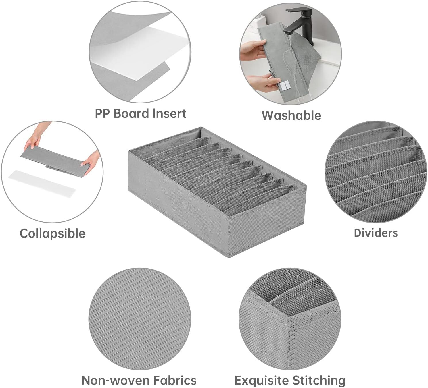 Coorganisers 4 Packs T-shirt Drawer Organizers for 10 GRIDS-SMALL SIZE, Gray Product Details Specific Uses For Product: Clothes,Clothing,Socks,Underwear Material: Polyester Special Feature: Folded, Stackable Color: Gray Brand: Coorganisers Finish Type: 表面未经处理 Product Dimensions: 15.74"D x 3.93"W x 9.05"H Shape: Rectangular Number of Items: 4 Manufacturer: Coorganisers Part Number: COTO-06GY Item Weight: 1 pounds Country of Origin: China Item model number: COTO-06GY Size: 10 GRIDS-SMALL SIZE Finish: 表面未经处理 Special Features: Folded, Stackable Batteries Required?: No Specific Uses For Product: Clothes,Clothing,Socks,Underwear Material: Polyester Special Feature: Folded, Stackable Color: Gray Brand: Coorganisers Finish Type: 表面未经处理 Product Dimensions: 15.74"D x 3.93"W x 9.05"H Shape: Rectangular Number of Items: 4 Mounting TypeItem Weight: Insert Mount16 Ounces Number of CompartmentsUnit Count: 104.0 Count 【3 different Sizes to choose】We provide 3 different sizes of shirt organizer for you to choose from. 10 grids Small size can fit Thin T-shirts, tank tops, underwear,socksand something small. 6 grids medium size can fit short sleeve T-shirts, tights, leggings,etc. And 6 grids large size fits long-sleeved T-shirts and another clothes. Pick your drawer organizer for clothes according to the type of your clothes. 10 Grids Small Size:15.75in./40cm*9.05in./23cm*3.93in./10cm. 【10 Grids Divider】Each wardrobe organizer is divided into 10 separate grids, one grid, and one item, which can keep your clothes and closet neat and tidy and easy to pick and place in a short time. Plus, the foldable and stackable design can greatly improve the utilization of wardrobe space. 【Premium Material】Clothes drawer organizer is made of non-woven fabric with delicate stitching, which is durable and not easy to fade. And the PP board insert on four sides is a great addition to the product. Compared with the old version, our drawer organizer for clothing can keep shape when empty. 【EASY TO ASSEMBLE】T-shirt organizer is very easy to assemble, just unfold it, insert the PP board, and then done. clothing storage organizer is washable, rinse it under water to keep clean when necessary. Please do not wash it by wash machine.