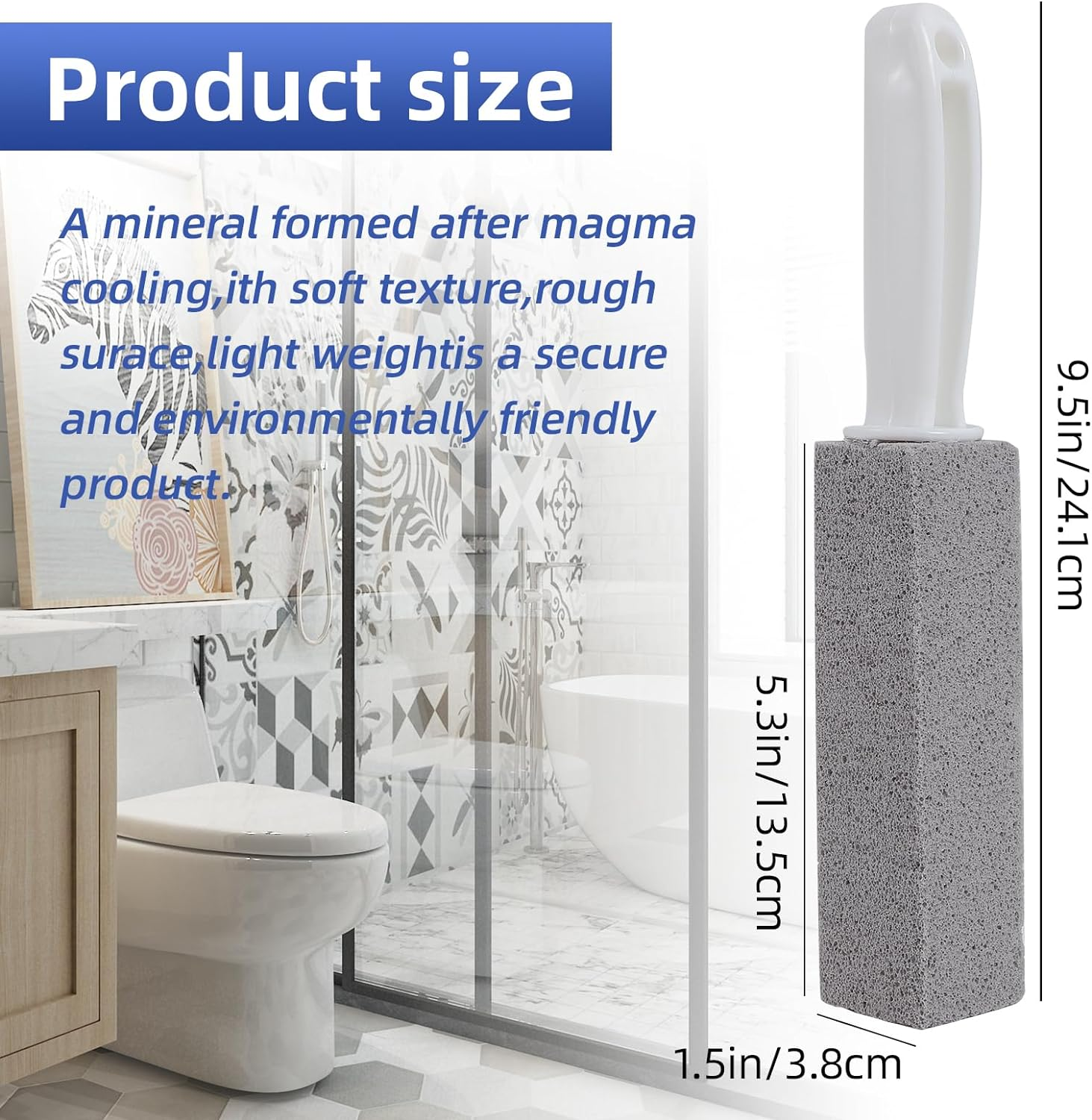 【Versatile Cleaning Tool】:Powerfully cleans away limescale stain, hard water rings,rust, our pumice toilet brush not only great for toilet bowls but also works on tiles, bbq grill, pools, bath tubs and ceramic surfaces. 【Easy To Grip Handle】:The pumice stone comes with a handle for easy handling,transforming the strenuous toilet cleaning task into a breeze. There is a hole at the top of the handle, you can hang it on the hinge clip to storage after using. 【High Quality Material】:Made of natural pumice, delicate and strong, with high density.It will not scratch your tiles and metals, It is preferred over ordinary toilet brush and cleansers as the most effective lean toilet. 【Effectively Clean The Toilet】:Each pumice stone can be sharpened into different shapes to clean the narrow edges and corners that other cleaning tools aren't able to reacheffortlessly removing stubborn marks, and the cleaning process is simple, convenient and effective. 【Easy To Use】:Wet the pumice stone and gently press it on the toilet in a straight motion, and your toilet will be as clean as new. Product Description