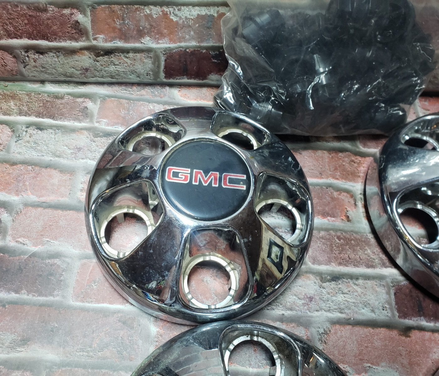 Set of 4 1986-2002 GMC Safari Wheel Center Rim Cap Hub Cover 5 Lug 15697614 OEM. Includes the lug caps. New old stock. One of the tabs is broken. I'm pointing to it in one of the photos. One also has some tarnish or residue on it that might clean up.