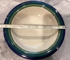 The Pfaltzgraff Ocean Breeze 8 1/4" Blue Green Rimmed Soup Bowls are a set of stoneware bowls featuring a beautiful Ocean Breeze pattern in blue and green. Made in the United States, these round soup bowls have an 8.25-inch diameter and are marked with an incised backstamp. The Pfaltzgraff brand ensures quality and craftsmanship, making these bowls an attractive and practical addition to any kitchen or dining table. Please view all photos.
