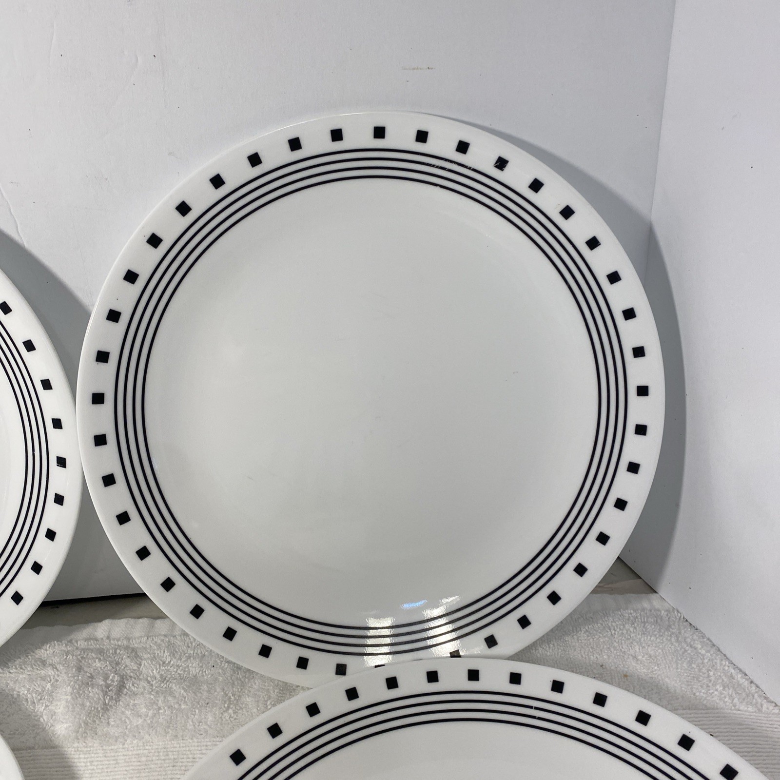 setting for 4 Corelle City Bolck white & black 4 cereal bowls & 4 dinner plates . Condition is Used. Shipped with USPS Ground Advantage.