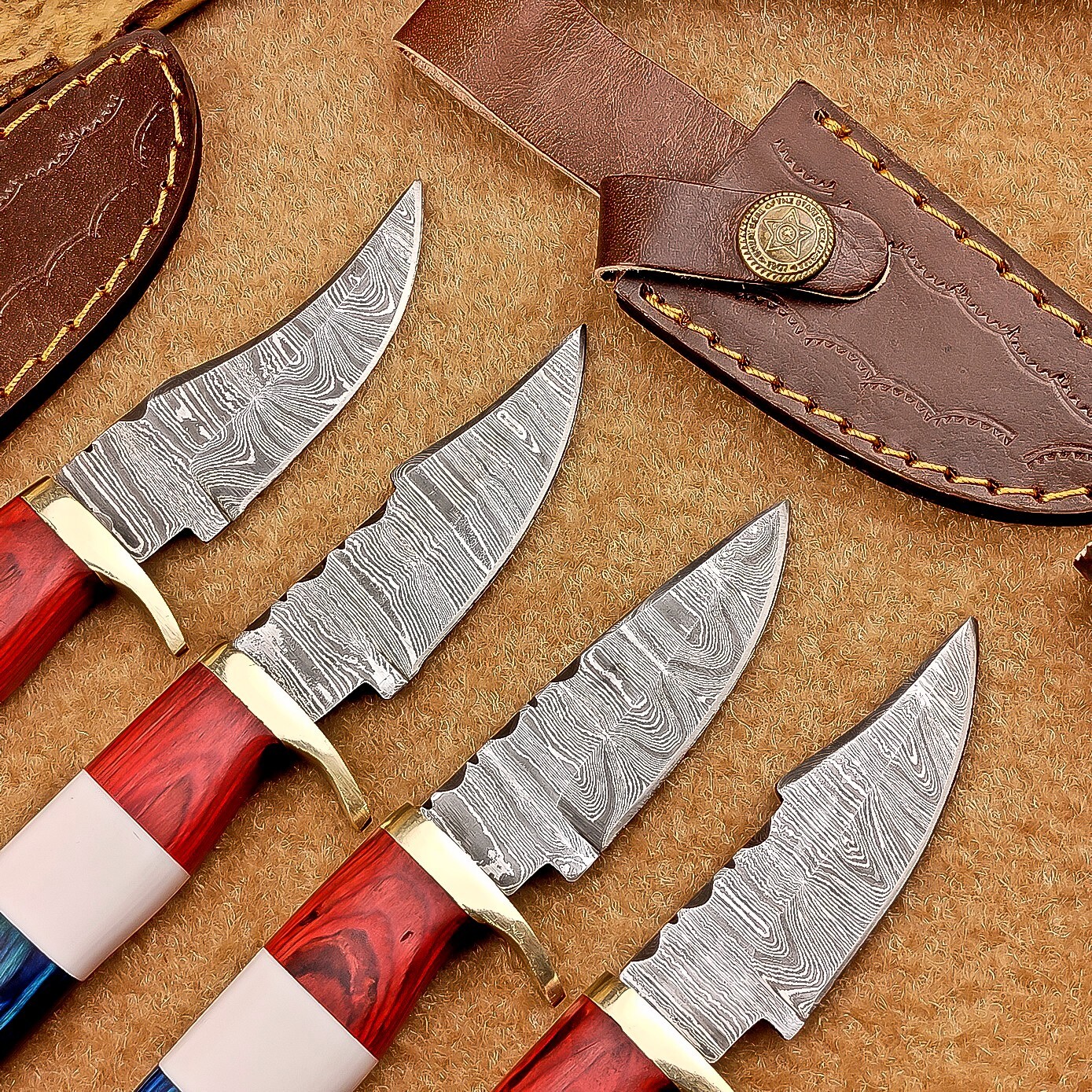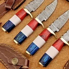 LOT OF 4 PCS! Handmade Damascus Hunting Knives – Multicolor Wood Handles Specifications: Overall Length: 6.0" Blade Thickness: ~4 mm Blade Material: Damascus Steel Handle Material: Multicolor wood and camel bone with mosaic pin with hand casted brass bolster. Includes: Leather sheaths Blade Craftsmanship: Blades are made from 1095 & 15N20 High Carbon Tool Steel with over 256 layers and a hardness of 58-60 HRC for durability and sharpness. Spine of the blade tang has excellent fire work Care Instructions: Sharpen with a Diamond Wet Stone at a 20-degree angle. Clean with soap and water, dry thoroughly, and apply gun oil. Store away from the sheath to prevent rust. Important Notes for Buyers: Verify your country’s import regulations before purchase. Customs duties, if any, are the buyer’s responsibility. Shipping & Returns: Free shipping included. 14-day return policy applies. Contact Us: Message us anytime. We respond within 24 hours.