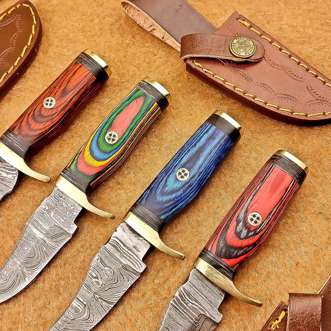 LOT OF 4 PCS! Handmade Damascus Hunting Knives , Skinner Knives Specifications: Overall Length: 6.0" Blade Thickness: ~4 mm Blade Material: Damascus Steel Handle Material: Hard wood with mosaic pin and Brass bolster Includes: Leather sheaths Blade Craftsmanship: Blades are made from 1095 & 15N20 High Carbon Tool Steel with over 256 layers and a hardness of 58-60 HRC for durability and sharpness. Spine of the blade tang has excellent fire work. Care Instructions: Sharpen with a Diamond Wet Stone at a 20-degree angle. Clean with soap and water, dry thoroughly, and apply gun oil. Store away from the sheath to prevent rust. Important Notes for Buyers: Verify your country’s import regulations before purchase. Customs duties, if any, are the buyer’s responsibility. Shipping & Returns: Free shipping included. 14-day return policy applies. Contact Us: Message us anytime. We respond within 24 hours.