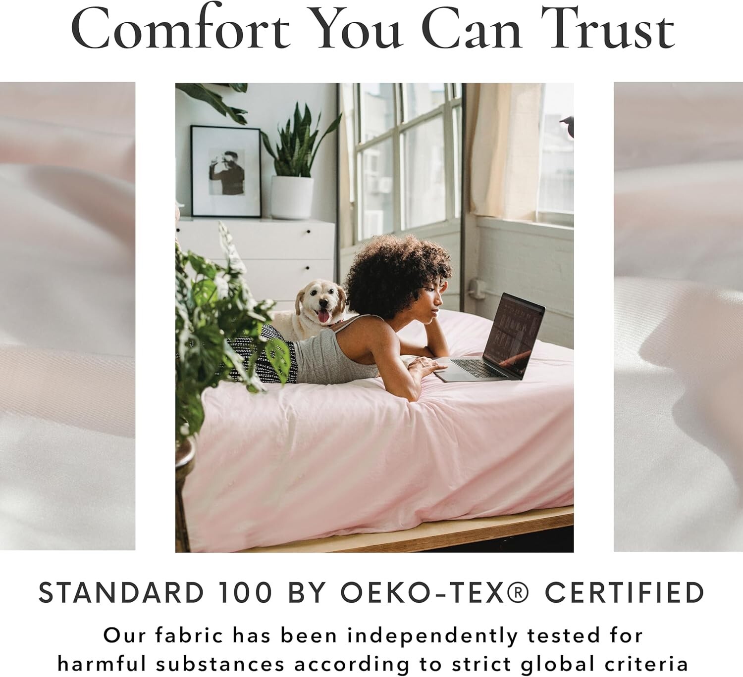4 Piece King Size Sheet Set, 100% Viscose Made from Bamboo, Breathable, Ultra Soft Cooling Bed Sheets for Hot Sleepers, Beddings with Deep Pockets Fit 16" Mattress, Light Pink Dreamy Soft, Gift-Ready. Indulge in cozy luxury with our king size bamboo sheets set, made from 100% Viscose from Bamboo. Silky-soft and smoother than Egyptian cotton, they’re the perfect holiday gift for restful nights. Stay Cool All Night. Sleep cool with our king size cooling sheets sets, crafted with breathable, moisture-wicking fabric. Perfect for hot sleepers or anyone seeking all-night comfort. Complete California King Size Set. This King Size set includes 1 California King fitted sheet (72” x 84”), 1 flat sheet (108” x 106”), and 2 pillowcases (20” x 40”). Deep pockets and reinforced elastic ensure a snug fit on mattresses up to 16”. Effortless Care, Naturally Safe. Enjoy sheets that are as practical as they are luxurious. Our king size bamboo sheets are machine washable, fade-resistant, and OEKO-TEX certified for safety. Easy to maintain and eco-friendly! Veteran-Founded Promise. As a veteran-founded USA small business, we offer a 180-night satisfaction promise with unmatched customer support. Sleep soundly with your king size bamboo sheets set knowing we’ve got you covered.