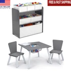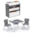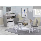 Complete your child? s playroom or bedroom with this 4-Piece Toddler Playroom Set by Delta Children. Vibrant and playful, this set includes a wooden play table with storage in the middle, two coordinating chairs and a multi-bin toy organizer. All items are at the perfect kid-sized height to help teach your little one responsibility and independence as they play, eat and clean up on their own. The adorable two-tone design ensures your little one? s playroom is a stylish and charming as the rest of your home. Ideal for both boys and girls, this kids? playroom set comes in two colors, Grey/White and Pink/White. Get it today--the play possibilities are endless with this versatile set! Recommended for ages 3+. Delta Children was founded around the idea of making safe, high-quality children's furniture affordable for all families. They know there's nothing more important than safety when it comes to your child's space. That's why all Delta Children products are built with long-lasting materials to ensure they stand up to years of jumping and playing. Plus, they are rigorously tested to meet or exceed all industry safety standards. Table and Chair Set with Storage: Table features handy toy keep in the center for easy storage Each chair holds up to 50 lbs. This set features fun and colorful two-tone design Made of engineered wood and solid wood | Scratch-resistant finish protects the table's colorful graphics Assembled dimensions: 24"L x 24"W x 17. 72"H | Easy assembly Multi-Bin Toy Organizer: Multi-Bin Toy Organizer features 6 bins in varying sizes to fit a wide variety of toys Colorful, two-tone design will help encourage your child to keep their space neat and tidy Made of engineered wood, solid wood and fabric Bin meets or exceeds all safety standards set by the CPSC Assembled dimensions: 24. 61? L x 11. 81? W x 26. 57? H | Easy assembly