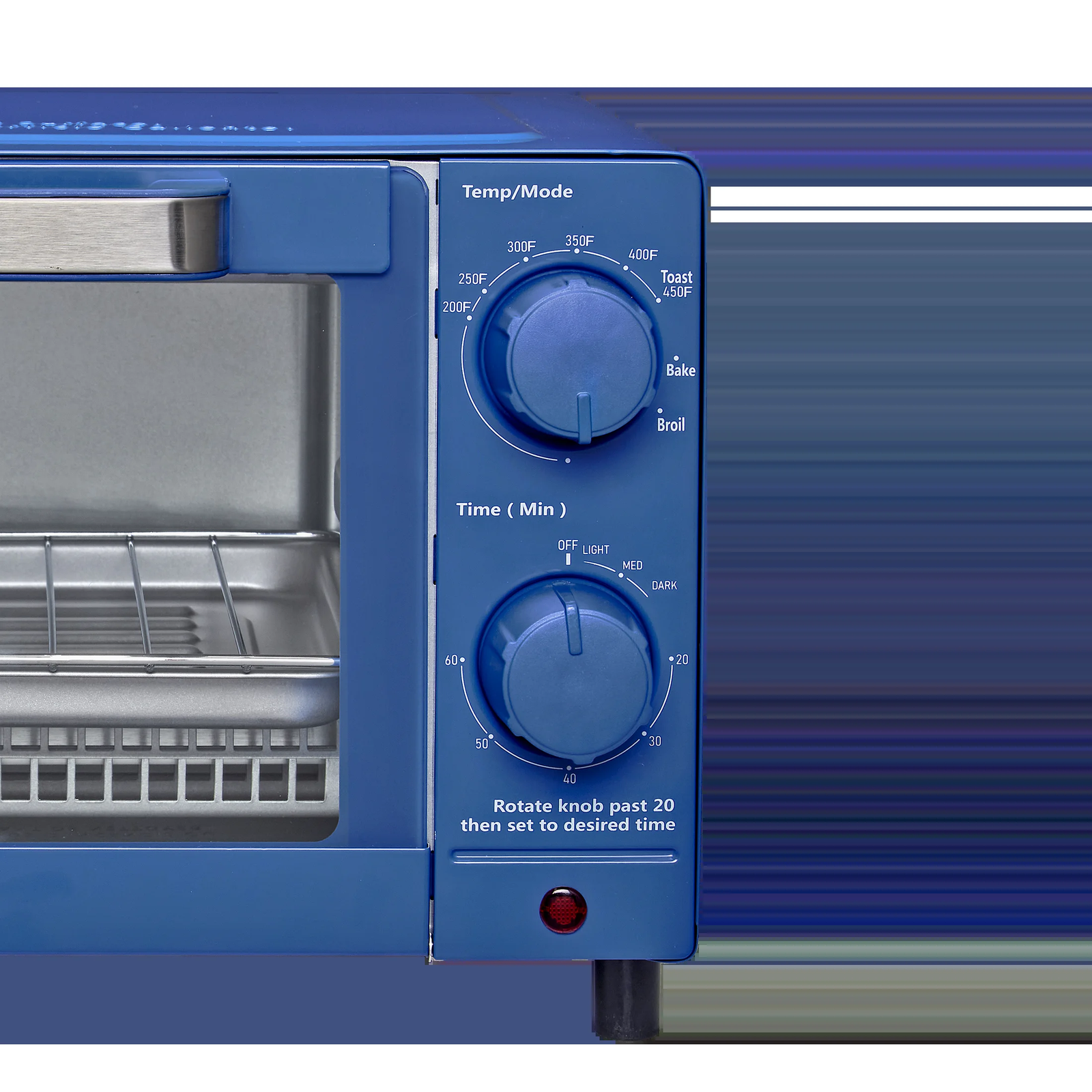 The Mainstays 4 slice Toaster Oven (MS5502550614-03) makes your life more convenient and efficient. It is perfect for preparing toast, sandwiches, pizza, and so much more. This toaster oven can accommodate up to 4 slices of bread or a 9-inch pizza, making it an ideal choice for busy households. The turn dial allows for easy adjustments to temperature mode and time settings, ensuring mealtime is swift and smooth. The compact size of this toaster oven uses less energy and counter space, making it easy to store. The sleek white finish coordinates beautifully with existing kitchen decor and color palettes, ensuring it seamlessly integrates into your home. The baking rack and baking pan are included, and the oven exterior is easy to wipe clean for quick and easy cleaning. The Mainstays Toaster Oven is sure to become a staple in your home cooking and baking ventures, bringing new experiences to your daily life. With its versatility, time-saving features, and stylish design, this toaster oven is a must-have for anyone looking to elevate their mealtime experience. Toast, Bake & Broil settings Fit 9-inch pizza or 4 slices of bread 2 Quartz heating elements Adjustable timer up to 60 minutes Power indicator light 1050 Watts of power Royal Blue, includes baking rack and baking pan