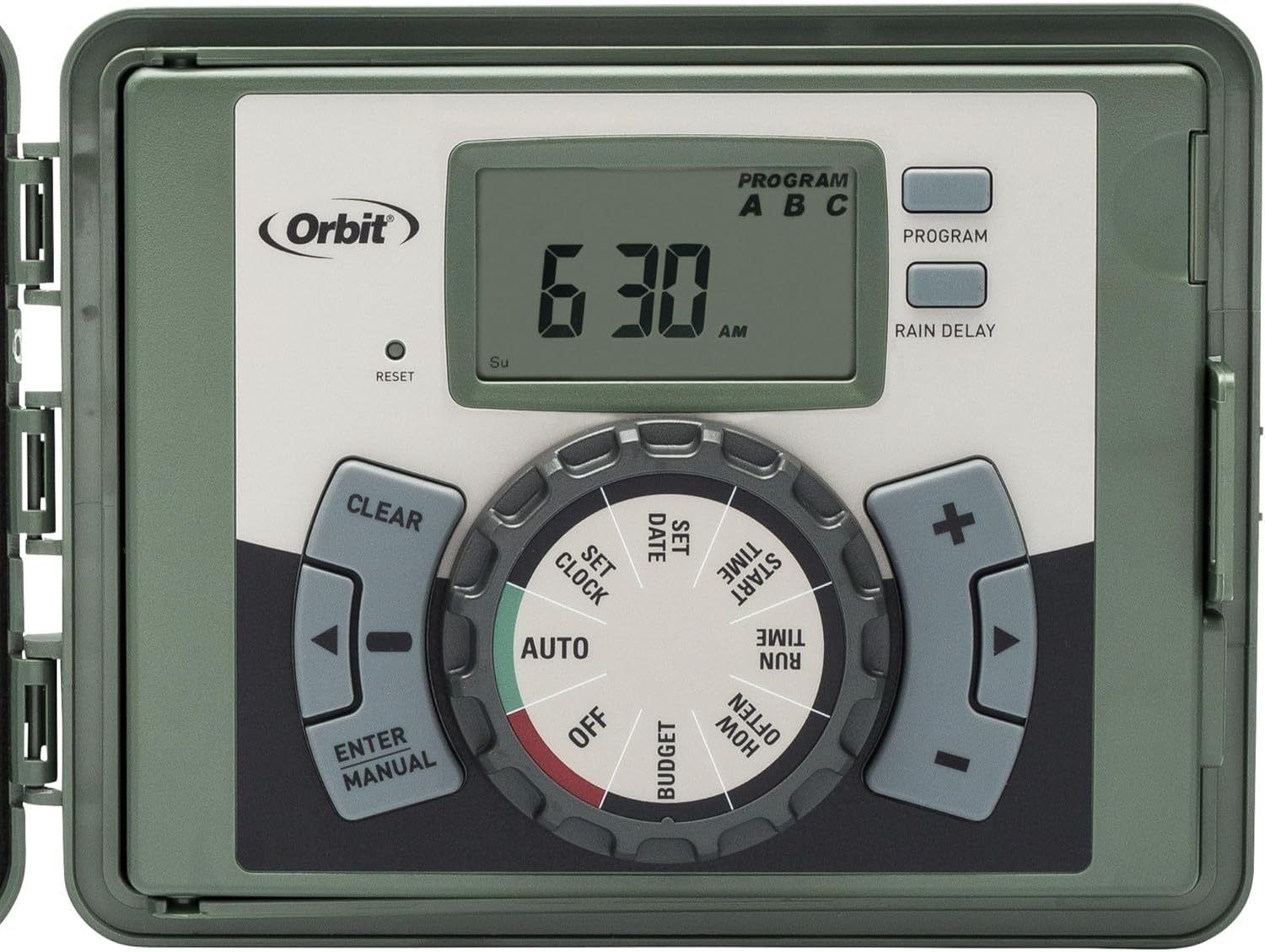 WATER YOUR YARD WITH EASE - Our Easy Set Logic sprinkler timer is the perfect choice for your yard, controlling up to 12 zones/stations for efficient irrigation. INDOOR AND OUTDOOR INSTALLATION - Engineered with a locking cabinet with two keys for both indoor and outdoor installation, our timer offers versatility and convenience for your sprinkler system. EFFORTLESS SETUP & OPERATION - With a swing panel and push wire terminals, installation and wiring are a breeze, allowing you to quickly set up tailored watering schedules. SMART WATERING FEATURES - Our timer allows you to create cycle and soak windows, stack overlapping runtimes, and even skip watering with the rain delay feature. VERSATILE AND RELIABLE - Compatible with 24 VAC valves from Orbit, Hydro-Rain, and other major brands, the timer simplifies automatic watering of your lawn and garden outdoors for your convenience and peace of mind. Introducing the Orbit Easy Set Logic Indoor/Outdoor Sprinkler Timer/Controller – the ultimate choice for residential sprinkler systems with up to 12 zones/stations. Engineered for seamless installation in both indoor and outdoor locations for outdoor sprinkler systems, this technologically-advanced timer is designed to revolutionize your yard irrigation experience.With a locking door equipped with two keys and a swing panel for easy access to wiring, installation and setup are a breeze. The A, B, and C program slots enable you to create up to three unique watering schedules tailored to different zones in your garden. Four different start times per program allow for cycle and soak windows, optimizing water infiltration into the soil.The Easy Set Logic timer's automatic runtime stacking mechanism ensures that only one solenoid operates at any given time. The manual run feature allows for zone testing and supplemental watering, giving you the flexibility to run one zone, select zones, or all zones for a specified duration.Say goodbye to wasteful watering with the rain delay feature, skipping irrigation in wet weather. The timer also includes a relay switch for adding an automatic rain and freeze sensor (sold separately), enhancing the efficiency of your irrigation system.Installation is simple – mount the timer, connect the common wire to the C terminal, and the zone wires to the numbered station terminals. The push wire terminals allow for tool-less insertion and removal of wires. It is compatible with standard 18-gauge sprinkler wire with 5 or 7 strands/wires, ensuring reliable and efficient operation.Upgrade your yard with the Orbit Easy Set Logic Indoor/Outdoor Sprinkler Timer/Controller. Enjoy the convenience, efficiency, and precision of an advanced irrigation system. Say goodbye to manual watering and experience a reliable, responsible, and hassle-free lawn care solution. Opt for the Orbit yard watering system and transform your garden into an oasis of lush greenery.