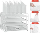 【Multifunctional Desk organizer】Marbrasse upgrade desktop file organizer has vertical and horizontal storage space – 4 sliding trays +5 vertical sorters +3 compartments drawer+ additional 2 pen holders . Upright section has five 3" Compartments for magazines, bill, file, book. Three types of use to meet your various office needs!! 【Easy to Assemble】Screw-Free installation design makes the paper letter tray super easy to install without other tools. Installation can be completed in minutes! 【Space Saving】Outfit your space with the Hanging Pencil Holder (Built-in Hooks) and top vertical file folder holder, which offers everything you need and make the most of your vertical and horizontal space to keep your desk neat so you can stay on task and do great work 【High Quality】The mesh desk file organizer is made of lightweight durable metal mesh and reinforced with a solid steel frame that makes it have long-lasting strength and reliable performance. 【Quality After Sales Service 】If you have any questions, please feel free to contact us and we'll help to solve it in 24 hours. You take NO RISK by ordering today! Product Description Mesh Desk File Organizer with Drawer Mararasse desk organizer is key when it comes to this bright black metal office supplies caddy. This durable metal material and functional piece is perfect for display and use in the office, home office, school, dorm, or any desk area. Tools, office supplies, important documents, whatever you need in an organized and easy-to-reach format, this organizer is perfect. Practical Desktop File Organizer Wide Applications This paper tray desk organizer blends perfectly with any contemporary office or room interior. The mesh letter tray looks great on your desk with its clean, simple lines and is easy to use. DIMENSIONS: 13.58” L x 9.65” W x 4.53” H Package including: 1 x Desk File Organizer 5 x Vertical File Holder 2 x Hanging Pencil holders 1 x 3 Compartment Drawer 1 X Product Instruction 3 Compartment Drawer Store your pens, pencils, sharpeners, staplers, scissors, rulers, razors, glue sticks 5 Vertical File Holder 5 vertical file holder design for simple storage of more files Non-Slip Rubber non-slip foot pad to prevent sliding or scratching surface