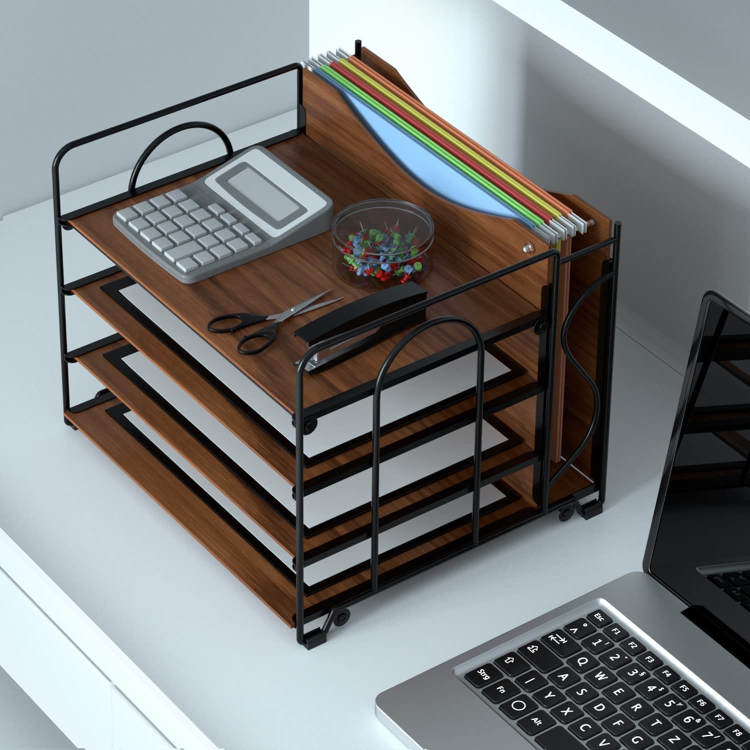 Introducing the File Organizer for Desk, a 4-tier wood desk organizer designed to keep your papers and office supplies neatly organized. This desk top organizer is built with sturdy MDF material, ensuring stability and durability. It features a hanging folder design that accommodates both letter and A4 size hanging folders, with adjustable metal rods for letter size hanging folders. The top and bottom layers are reinforced with hard metal rods for added support and load-bearing capacity. This office organization for desk has a practical design with sliding MDF sections for easy access to documents and a vertical upright section for hanging file holders. It is lightweight yet sturdy, making it an ideal addition to any office, school, or home desk. The File Organizer for Desk comes in a stylish walnut brown color and is easy to assemble. Please note that screws are pre-installed and need to be unscrewed before installation. Care instructions include cleaning with a dry cloth only to avoid damage. The dimensions of the horizontal section are approximately 13''x 9.3''x 2.4'' and the vertical section is 13''x 11'' x2.4''. 【HANGING FOLDERS DESIGN】Our File Organizer is designed with selectable widths for LETTER and A4 SIZE. If you'd like to use LETTER SIZE's hanging folders, you can install the small metal rods to shorten the distance between hanging rods. It's classy and elegant paper organizer for desk. Great balance between wood and iron, matching all kinds of office styles 【STURDY MDF PAPER TRAY】The File Organizer for desk is constructed with lightweight but sturdy MDF which is more stable and stylish than traditional iron-mesh office desk organizer. 4 rubber pads to prevent desk organizer tray from sliding or scratching surfaces. The top and bottom layers are supported by two hard metal rods, making it sturdy and more load-bearing 【DESK ORGANIZER TRAY STRUCTURE】The horizontal section is 13''x 9.3''x 2.4'' and vertical section is 13''x 11'' x2.4''. The side frames are designed for easily lifting & moving File Organizer. 4 sliding MDF for easily accessing documents and the vertical upright section for hanging file holders. File Organizer for desk is practical paper letter tray and perfectly for holding loose paper, documents, folders, binders, notebooks and office supplies 【SPECIAL NOTE】To prevent the screws from being lost in transit, ALL THE SCREWS HAVE BEEN SCREWED INTO THE ENDS OF THE RODS and need to be unscrewed before installation. Our paper organizer for desk is easy to assemble, very useful arrangement, no wasted space 【BRAND 】If you encounter any issues about office organizer for desk, please ASAP and we will or give you a