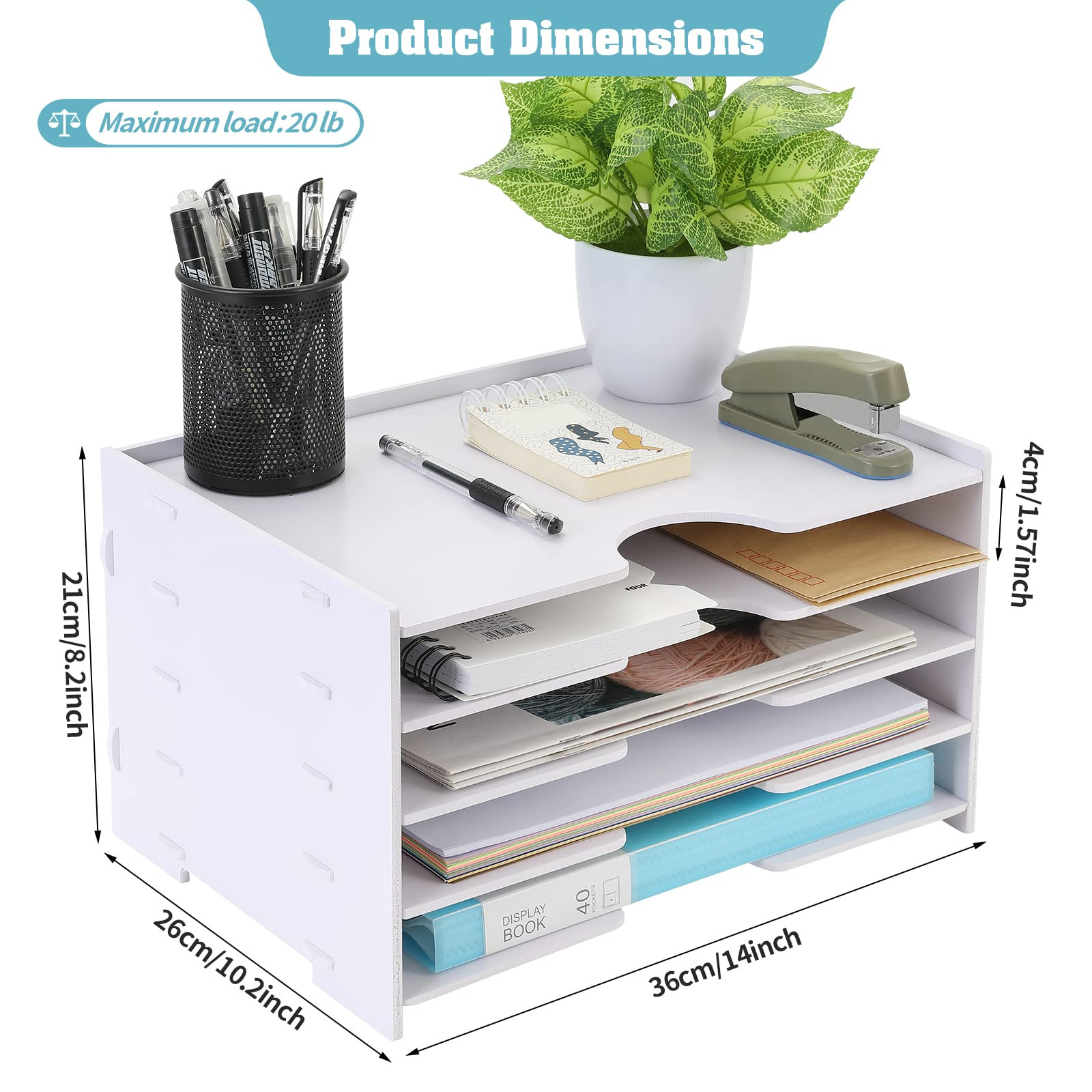 ❤Desk Four Layer Paper Storage Construction :Tabletop multi-layer scrapbook paper storage Tray specially designed for collectiong and dispalying file,Horizontal File office mailbox organizer Tray with 8mm thickness PVC board ,sturdy &smooth broad,stable enough to hold more paper and other small items. Open design lets you identify File per cell quickly. Perfect solution to keep your desk organized in a different new way. ❤ High ignition point:Fire-resistant synthetic plastic wood material,High ignition point,side hollow design to speed up heat dissipation,not flammable.Compared with other materials such as plastic desk shelves organizer and ordinary wood materials, Wood File Organizer Paper Sorter can protect your important documents and prevent them from being destroyed. ❤Quick &Easy Assembling:4 Tier office file sorter organizer trays is portable and easy to assemble, just about 5 minutes to finish assembling without any tools, File Folder Racks is pretty time-saving and convenient and saving space.Office Desk Organizer Shelves with 4 divider organizer , keep work efficient, Help you quickly find the documents you want,the effect of using multiple file disks together is more obvious. ❤Wide Application: Desk paper storage caddy trays is a great helper in office to store different kinds of items, such as A4 paper, stationery,documents, notebooks, phone and other small stuffs.office essential,which will add much more fun to your desk and help you get rid of mess.No matter in your living room, bedroom, office,classroom, as long as there is enough space, it could be a best fit for organizing and sorting paper documents. ❤Desk Paper Holder &File organizers gift:Standrad size of 4 Slot paper organizer tray is 36✕26✕21cm/14✕11 ✕ 9 inchs ,tier height is about 4 cm/ 2 inchs. Compartment for your to sort different files or office essentials. And saving space for your table.Good decoration for office and home.This paperwork organiser shelf gift for your family and friends.
