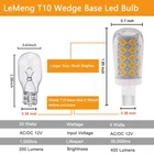 Warm Tips: * This LED bulb can't work for any under counter or cabinet lighting, which might cause flicker. *This Wedge base width is 0.36inch, please check your original bulb's base before purchase. *For automotive RV lighting, the LED bulb is used for T10 wedge bulbs replacement and for dome lights only, NOT for the automotive T5 Instrument Cluster Gauge Dashboard Indicator lamps. Dimmable: No Material: Ceramic PC cover Color Temperature: Daylight White 6000 Kelvin Voltage: AC10-18Volt & DC10-24 Volts Base Type: T10 miniature Wedge base Wattage: 4 watts Lumen: 400Lm Incandescent Equivalent: 20W 25W 30W 40W CRI: >82 Size: Diameter 0.7* Height 1.85inch Application: Creating a bright and cool daylight white full glow ambient atmosphere,perfect for Interior RV Trailer Camper Marine Boats Yachts lights, outdoor and landscape lighting, step lights, deck lights, driveway lights, path lights, gazebo lights, paver lights. Package Include: 5 x 4watts LED T10 Non-dimmable Cool Daylight White Bulb Lights 6000K 360 degree ✔This T10 Wedge base width is 0.36inch, please check your original bulb's base before purchase. AC/DC12V T10 3Watts LED Bulb is not waterproof, please use it in dry environment/protect from water (not enclosed fixture). This LED bulb could NOT work for any under counter or cabinet lighting, which might cause flicker! ✔4W 400Lm: Designed for 30-40Watts 912 921 922 914 halogen replacement.Pefect for interior automotive car RV motorhome trailer camper marine yatch boat lighting; outdoor landscape garden yard patio path driveway step deck walkway lighting etc. ✔Easy Installation: T10 miniature Wedge base direct plug-and-play under AC10-18V/DC12-24V low voltage, much less heat than halogen bulb, can reduced operating temperatures among all LED lighting inside your travel trailer RV. Save 90% on electricity bill of lighting. ✔High Color Rendering Index:Ra>82, more vivid. 6000K bright daylight white color lights are offered with 360 degree beam angle. No strobe and Eco-Friendly. ✔Long lifespan: Low power consumption and 30000 Hours Lifespan, Lower maintenance costs by reducing re-lamp frequency. 2 Year Warranty.Don't hesitate to contact us for any help.